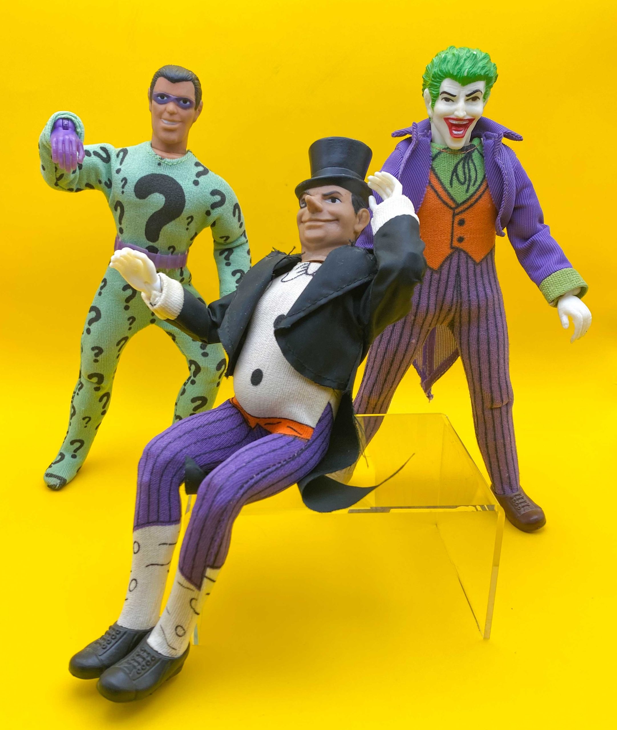 Official World’s Greatest Super-Heroes: The Super Foes – Mego, 1974. Mego’s use of the pinup images of Joker, Penguin and Riddler on their packaging for their various formats of superhero action figures and accessories further cemented those drawings in the subconscious of ’70s and early ’80s kids. But they went beyond merely repurposing the artwork and used them as the very basis for the figures themselves, particularly the 8-inch versions. The Joker’s hair and brown shoes, the Penguin’s smirk, and, especially, the Riddler’s snarly grin were adapted directly from the Infantino/Anderson images. Considering the incredible popularity of these figures, this further canonized those depictions.