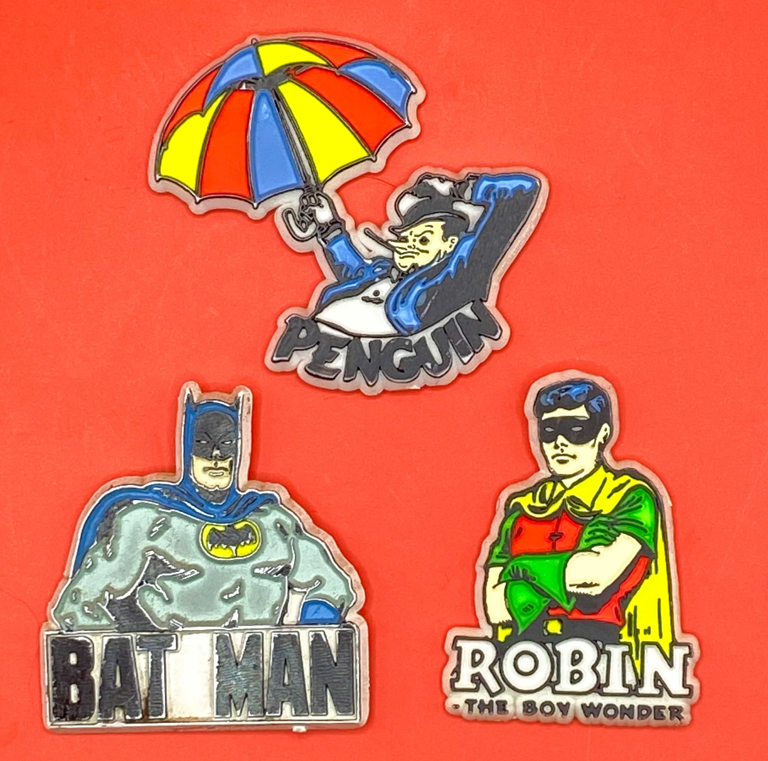 Figural Magnets – Monogram, 1975. In 1975, Monogram issued a wide range of die-cut figural magnets of DC and Marvel characters. Like most merchandise from this era, the Batman characters dominated the line. And nearly all of them were based on the pinup art by Infantino and Anderson. Each magnet also had a self-adhesive stick-on on the back as well, in case you wanted to stick it to something non-magnetic… like your parents’ car dashboard. In addition to Batman, Robin and Penguin seen here, they also released pinup-inspired magnets for Joker and Riddler.