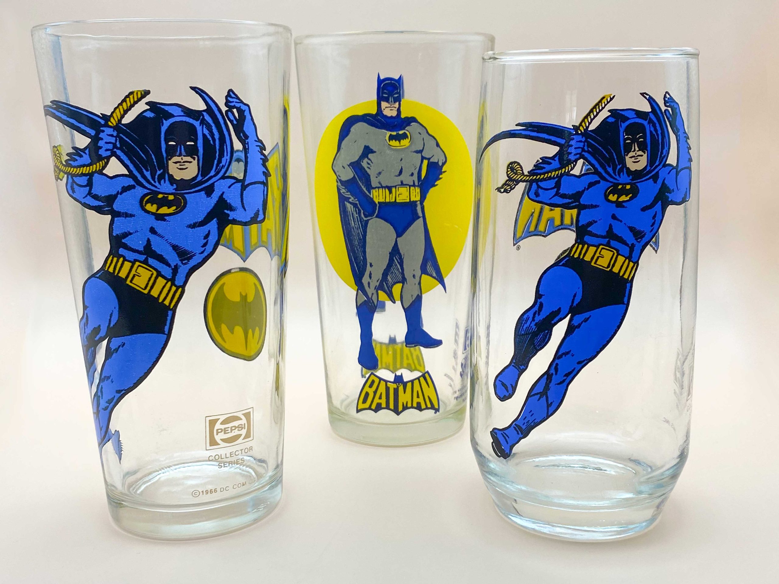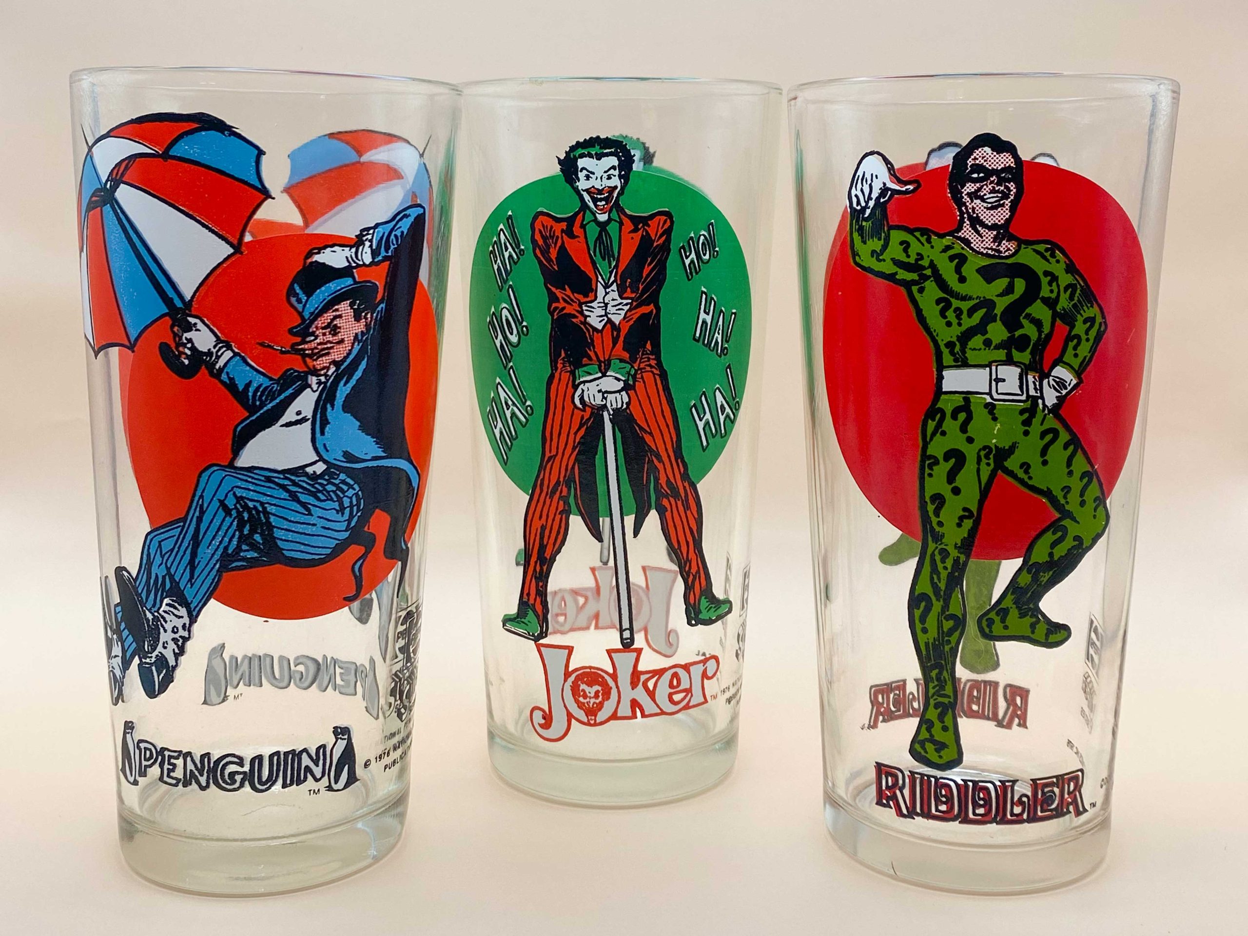 Pepsi Super Series/Collector Series Drinking Glasses – Pepsi, 1976/1978. A list of products based on these images could never be complete without an entry for the ubiquitous Pepsi Collector Series glasses. Pepsi partnered with DC for two series: the “moon” glass run from 1976, so named because of the circle or moon behind each character, and then a later series in 1978 that, unlike the first, didn’t repeat the same image on both sides of the glass but instead threw on a logo and insignia for each character. As always, Bat-characters dominated the line, with Gotham City represented by six in the 1976 moon series (Batman, Robin, Batgirl, Joker, Penguin and Riddler).