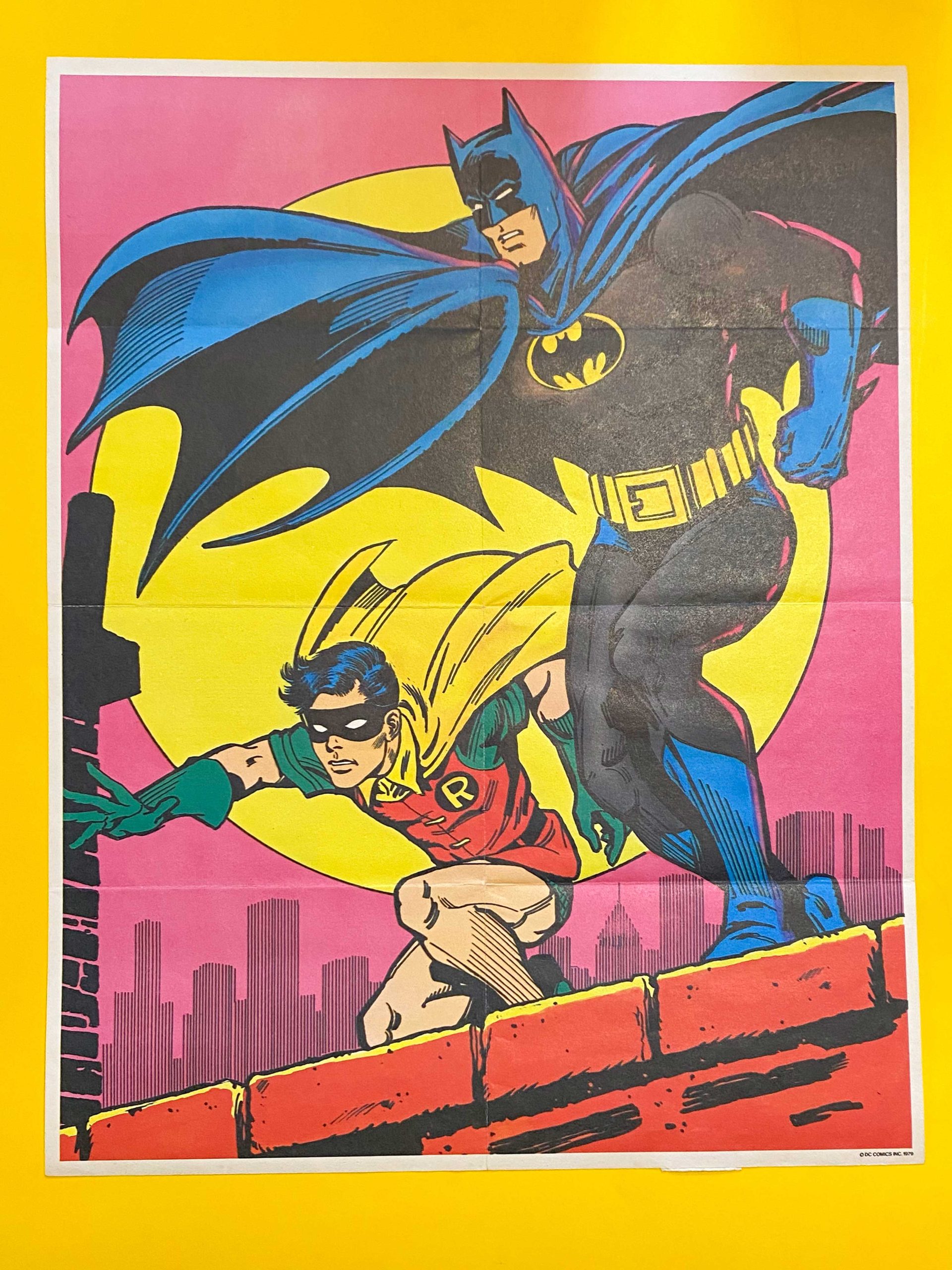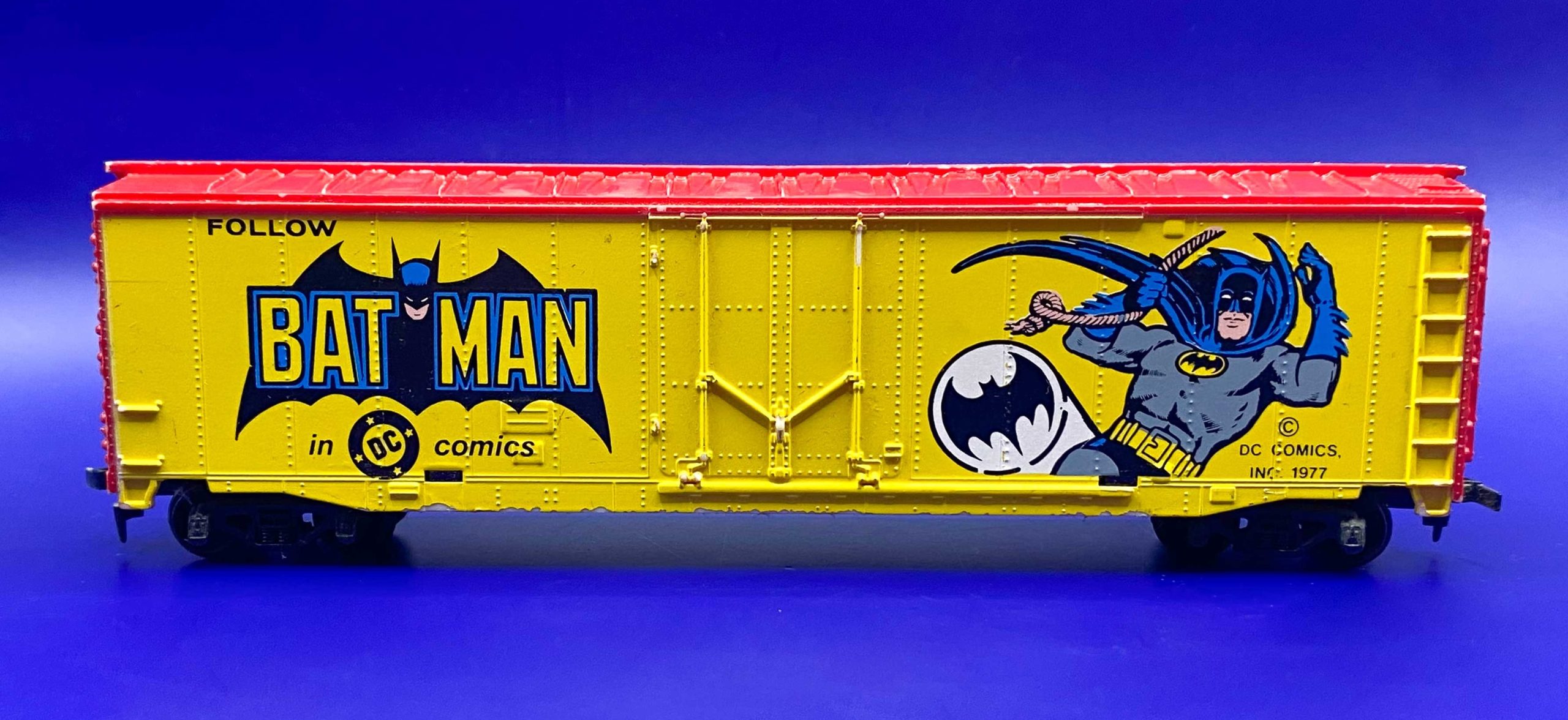 Batman Model Train Car – Tyco, 1977. In 1977, prolific radio-control toy and model train manufacturer Tyco released a fun series of train cars featuring DC superheroes advertising their own comics, and featuring the newly minted DC Bullet icon. Superman, Wonder Woman and Captain Marvel received cars, and of course so did Batman. Tyco repurposed the swinging image of the Caped Crusader from the pinup set, including the Batsignal. And the text, “Follow Batman in DC Comics,” makes this fit in with a nice train display set, adding some real-life marketing verisimilitude. If only there were actual train cars created in 1:1 scale!