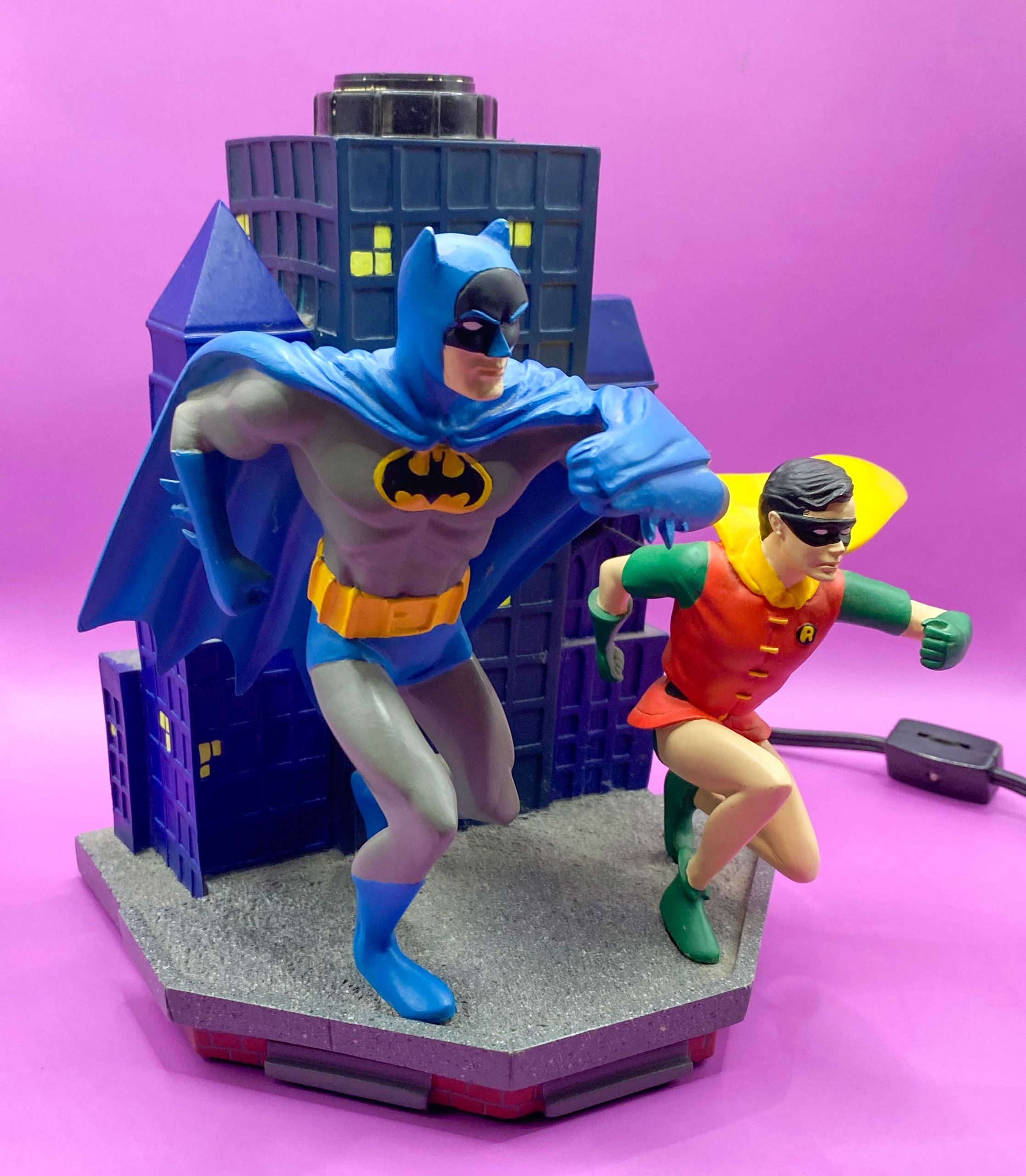 Batman and Robin Lamp – Warner Bros. Studio Store, 1999. The dearly departed Warner Bros. Studio Store had a bevy of great and unique DC-themed products, including a series of items based on Silver Age designs, particularly Infantino’s versions of Gotham’s denizens. This lamp strangely flips the actual rooftop image, swapping the sides Batman and Robin are on. But it’s still clearly based on that seminal masterpiece. It originally came with a cone-shaped lamp shade with the bat-symbol on it, but unfortunately mine got a little too close to the bulb and burned. Holy fire hazards!