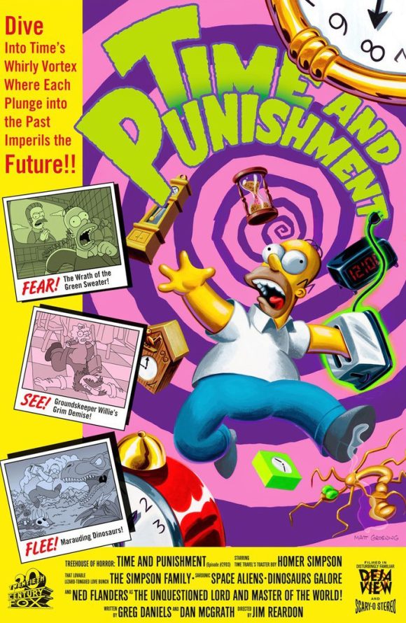 The subject is “Time and Punishment,” one of three segments from The Simpsons Treehouse of Horror V from 1994. If you’ve seen it, you may have recognized that the story itself is a parody of Ray Bradbury’s classic tale, “A Sound of Thunder.” And the title is a parody of the Dostoevsky novel, “Crime and Punishment,” making this print a parody triple-play!