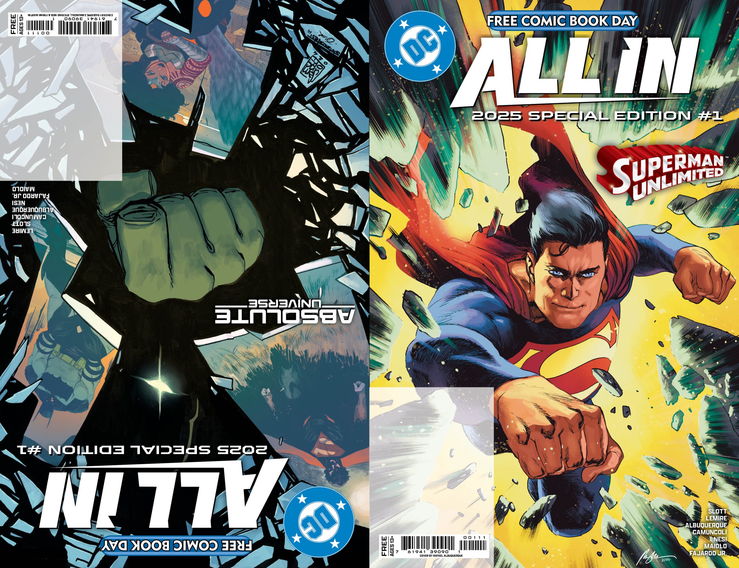 DC All In 2025 FCBD Special Edition, DC. A flip book including a prelude to the new Dan Slott/Rafael Albuquerque Superman Unlimited series, plus more Absolute Universe happenings. (The main version is free, but there are sketch and foil variants for $4.99 and $9.99, respectively.)