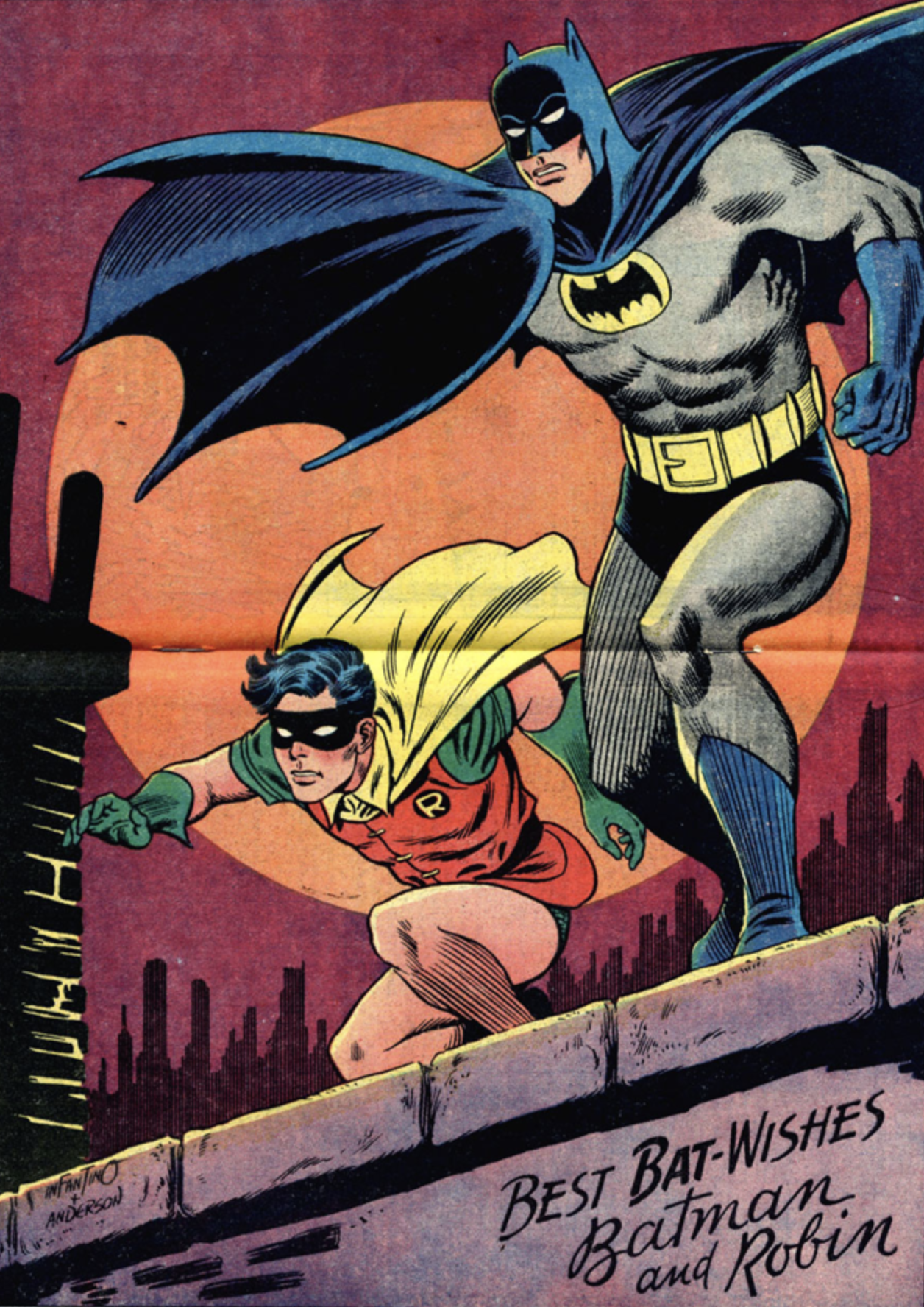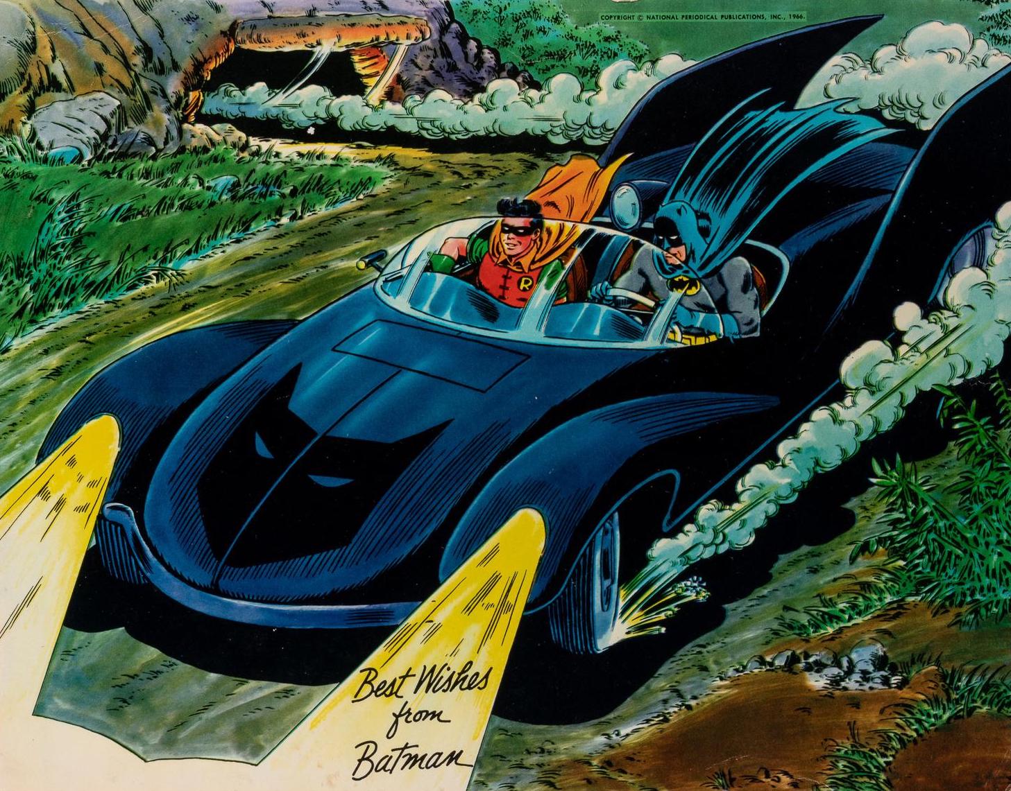 Interestingly, the Batmobile shot never quite caught on the same way, likely because the TV version of the car was so much more popular. But the others became ubiquitous, especially the Batman and Robin rooftop vigil, which we’ve written about many times over and which, to this day, is considered one of the greatest Bat-images of them all. (By the way, it made its first appearance nine days after the standing pose, as a similar centerspread in April 28’s Detective Comics #352.)