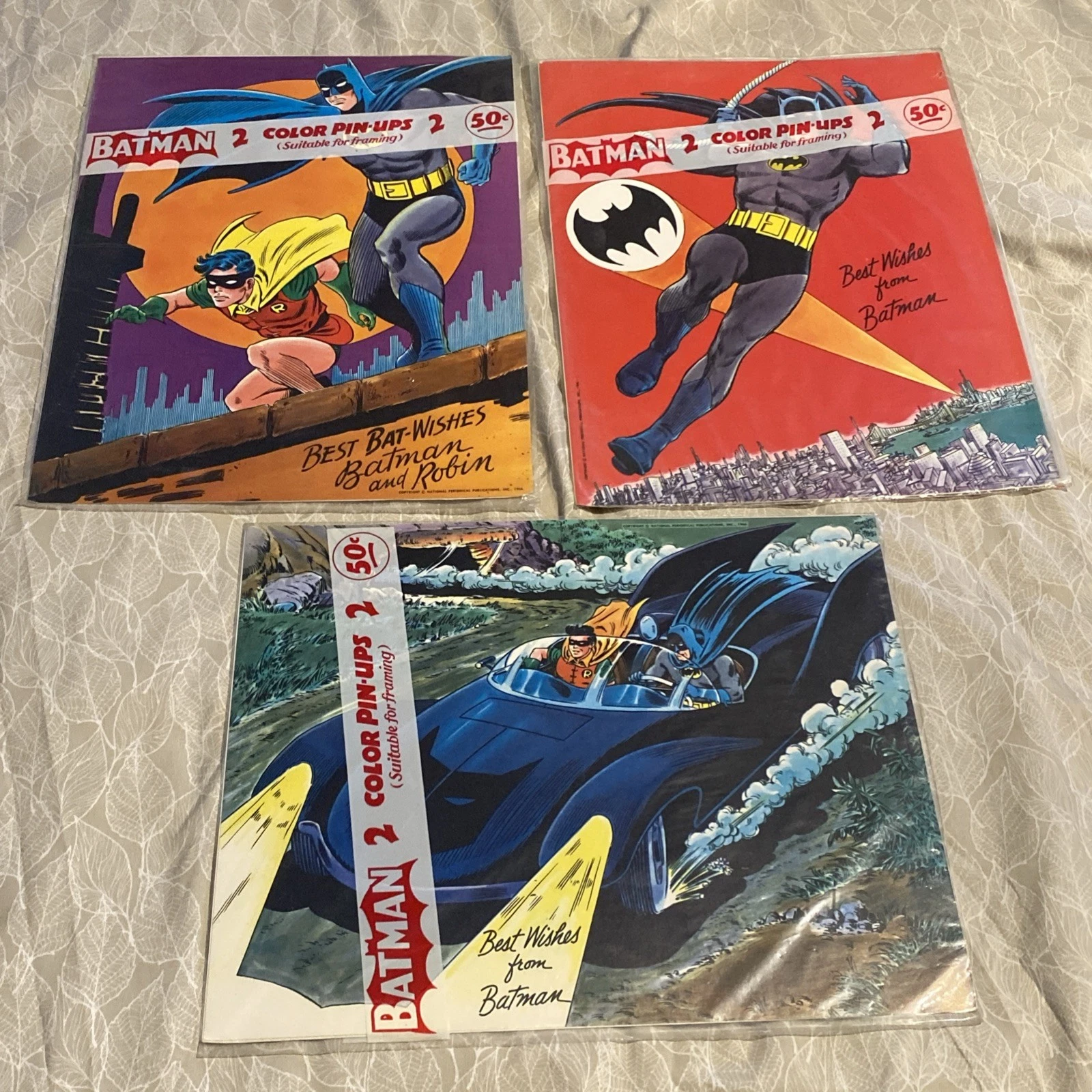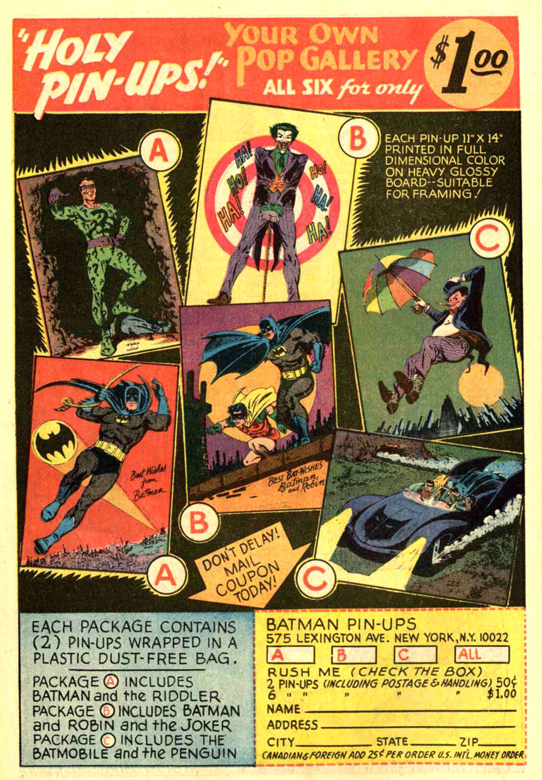 DC Comics itself decided to get in on the act by producing a set of six mail-away, 11″ x 14″ pinups featuring the art of Infantino and Anderson, their own artistic Dynamic Duo. For a mere 50 cents you could by one of three sets of two prints, featuring Batman and Robin on a rooftop; the Caped Crusaders in the Batmobile; Batman swinging over Gotham; and portraits of the Joker, Penguin and Riddler. If you saved your allowance, you could get all six for a buck.