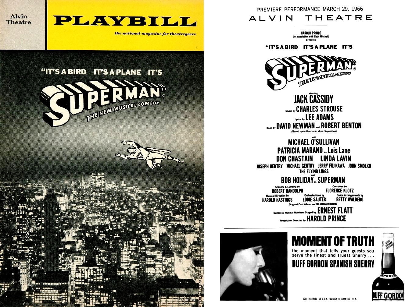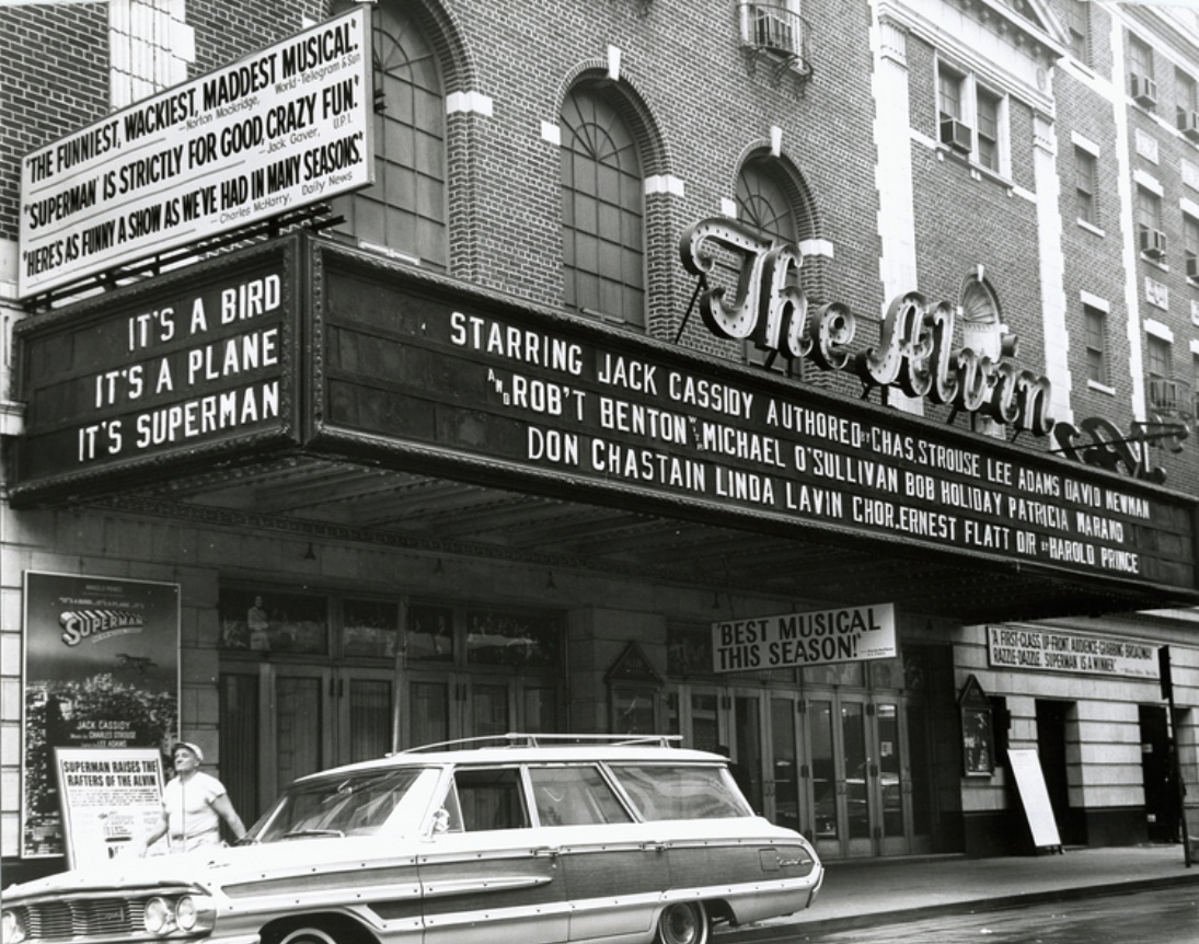 In the early 1960s, writer David Newman and his collaborator Robert Benton were looking for an idea to adapt into a new musical comedy. Newman’s wife picked up their son’s Superman comic off the floor and said they should make a show of the character. After two years of putting together all the elements – including music by Charles Strouse and lyrics by Lee Adams (the successful team from Bye Bye Birdie) and direction by Harold Prince — the show was ready to open on Broadway on March 29, 1966. (Trivia: The aerial sequences would be handled by “Flying by Foy,” the theatrical company that did the same for the Peter Pan stage show.)