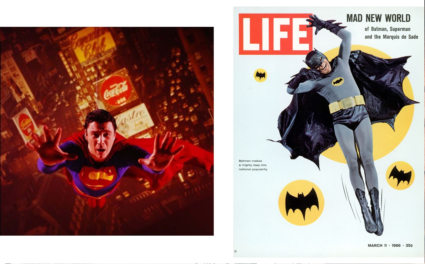 A few weeks prior to the official Broadway opening of It’s A Bird… It’s A Plane… It’s Superman, the competition between Superman and Batman played out on America’s newsstands. In its March 11, 1966, issue, Life magazine published an article titled “The Whole Country Goes Supermad,” covering The Mad Show (an off-Broadway show that opened January 9, 1966), the Batman TV program (which had its series debut January 12 of that year), and the then-upcoming Superman musical. In a last-minute decision, the Life cover (below) did not feature Holiday as Superman as had been planned; instead, it went to Adam West as Batman.