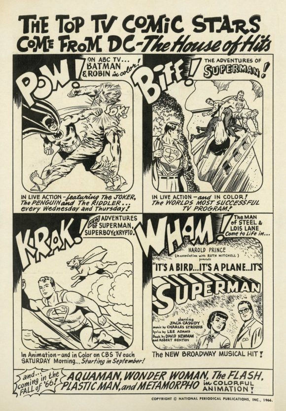 The reviews for It’s A Bird… It’s A Plane… It’s Superman were excellent, with The New York Times declaring, “It is easily the best musical so far this season.” The show also garnered three Tony Award nominations — but it failed to attract audiences and, after just 129 performances, closed July 17, 1966. The predominant theory is that people could see the Batman TV show for free at home, so why go out and pay to see It’s Superman? However, DC did plug it within their comics as a hit: