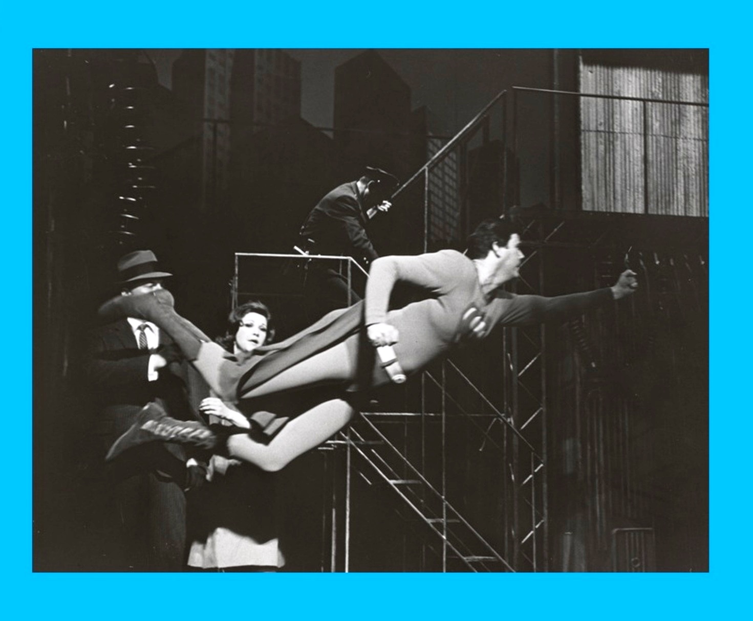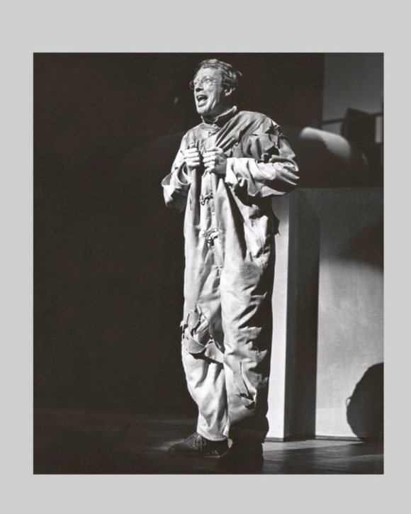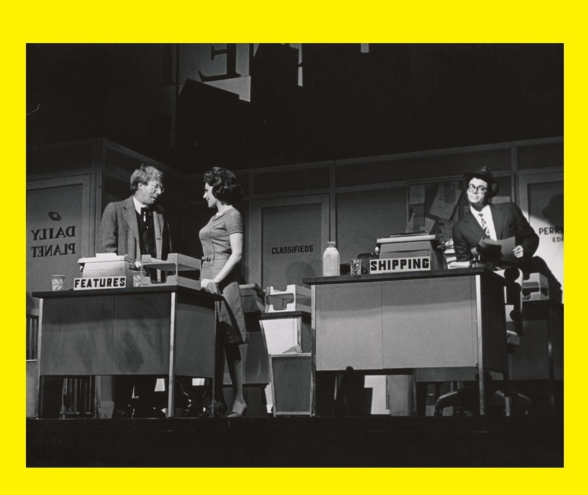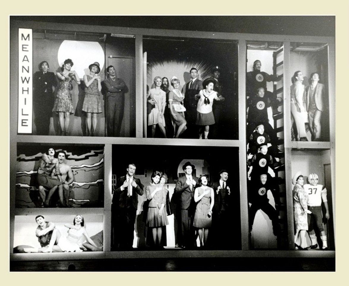 Everyone in the cast other than Cassidy received featured status, including Patricia Marand (far left, replacing Joan Hotchkis, the original Lois during on-the-road tryouts pre-Broadway); Michael O’Sullivan (center) as Dr. Abner Sedgwick, the villain of the piece; Linda Lavin (right) as Max’s secretary and sometimes girlfriend, Sydney; and Don Chastain (lower right) as Jim Morgan, Sedgwick’s assistant. The Superman/Clark Kent of the production, Bob Holiday, is at the rear of the photo.