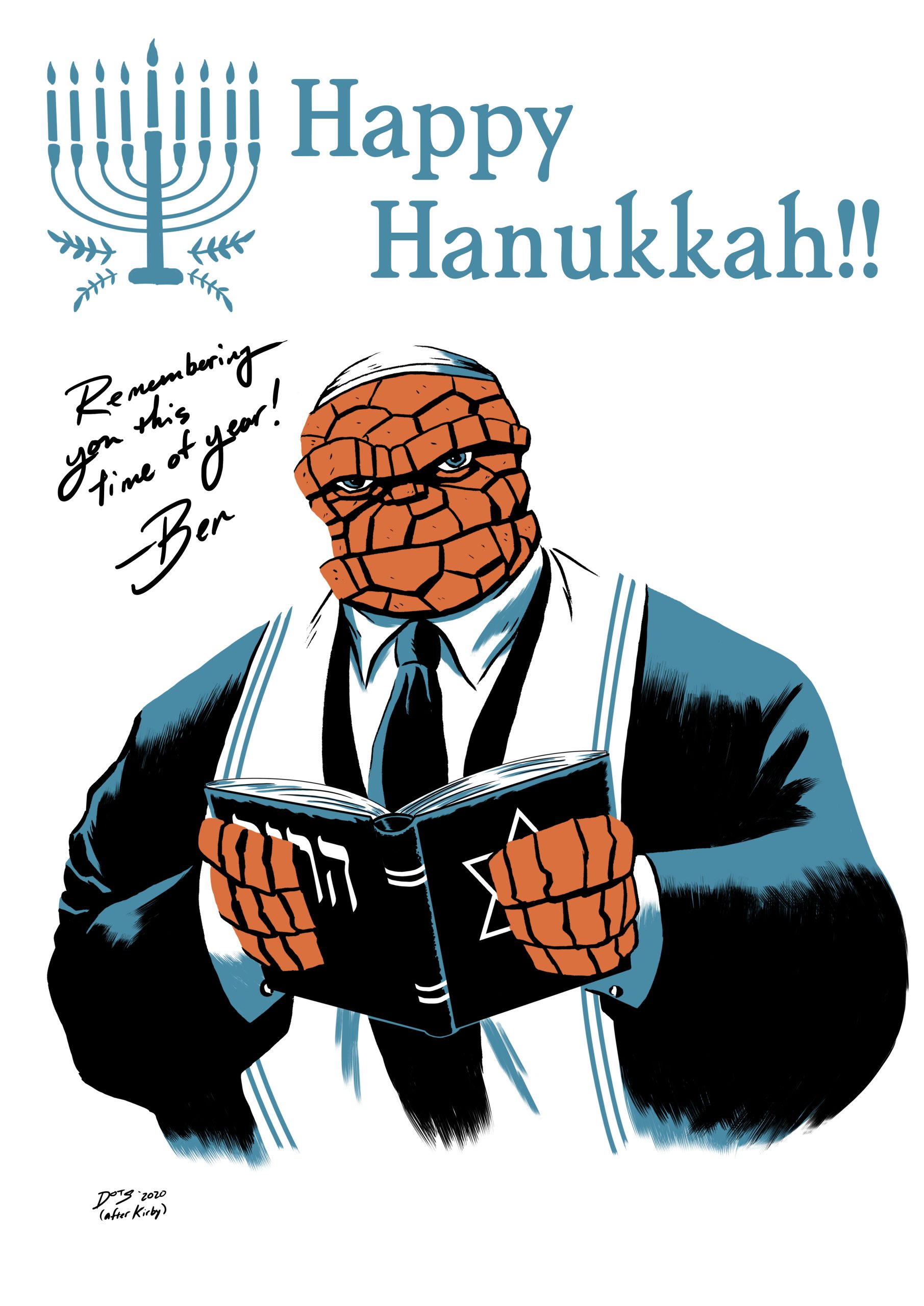 Here, we have my own attempt at our ever-lovin’ blue-eyed Thing — wishing you a Happy Hanukkah! (Dan spells it Chanukah.)