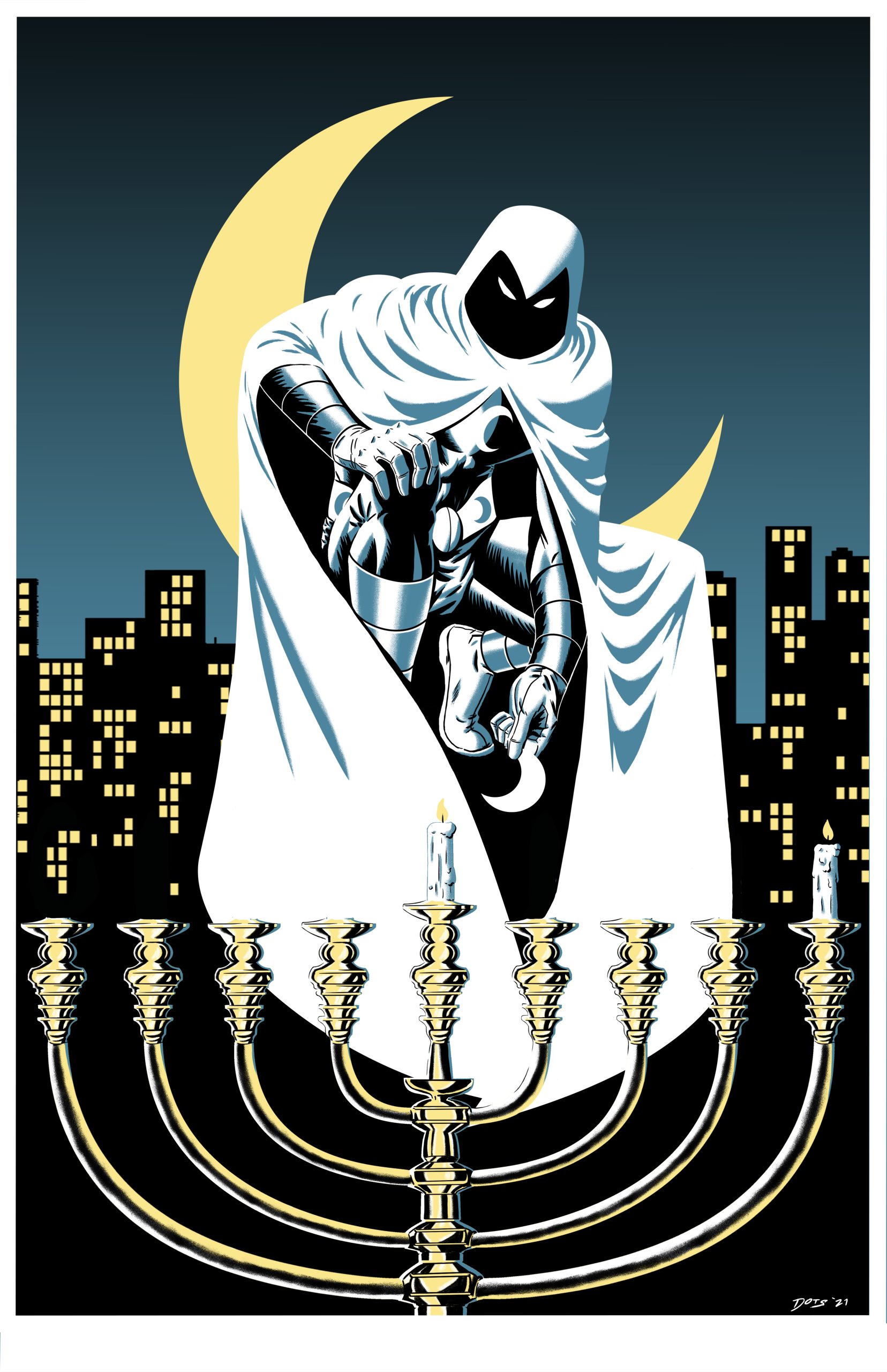 On a more brooding note, we also have the mysterious Moon Knight — lighting the first candle on the menorah.