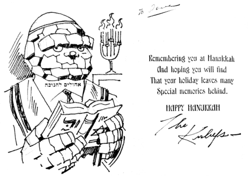 Here, we have my own attempt at our ever-lovin’ blue-eyed Thing — wishing you a Happy Hanukkah! (Dan spells it Chanukah.)