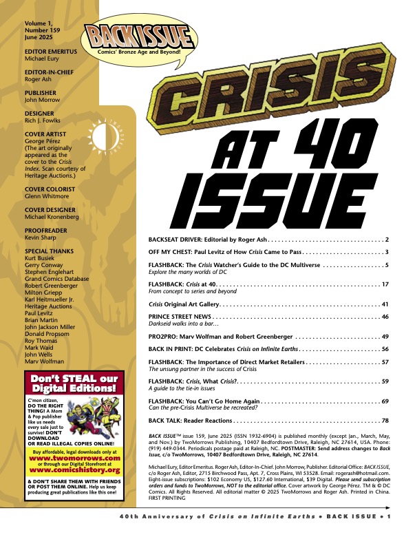 TwoMorrows’ Back Issue magazine, after a hiatus forced by Diamond Comics’ bankruptcy, returns this week with Issue #159 — a Crisis spotlight. The ish will ship to those who pre-ordered from the publisher and is due in comics shops June 11.