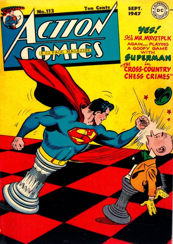 Action Comics #112 (Sept. 1947, DC). Checking an opponent.