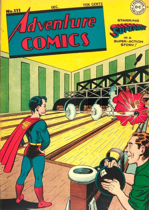 Adventure Comics #111 (Dec. 1946, DC). There’s nothing in the rules that says you can’t try blowing down the pins. I’ve seen plenty of players try it when one is still standing.