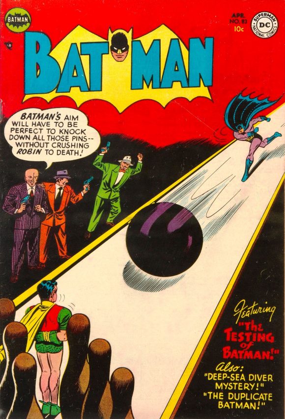 Batman #83 (April 1954, DC). For a bowling ball, this is clearly above the regulation size (27 inches circumference). However, Batman is so used to giant souvenirs in the Batcave, this is right up his alley. (Ouch, there goes my immunity.)
