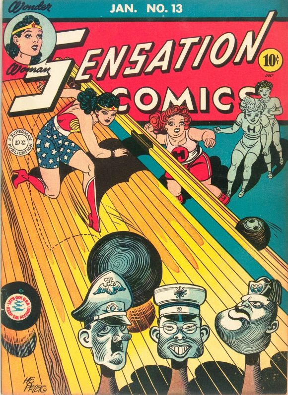 Sensation Comics #13 (Jan. 1943, DC.) I don’t need a Hoyle rule book to tell me that Wonder Woman has committed a foul here by stepping way over the line. But, then, Hitler, Hirohito, and Mussolini were very foul and stepped WAY over the line.