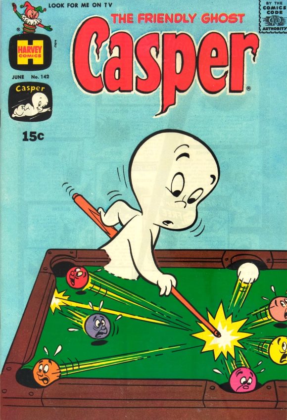 The Friendly Ghost, Casper #142 (June 1970, Harvey). A funny cover where even cue balls are afraid of ghosts. However, if Casper is floating up through the table, he is violating the rule about keeping one foot on the ground.