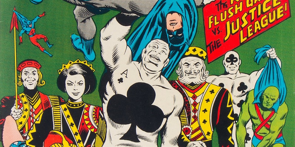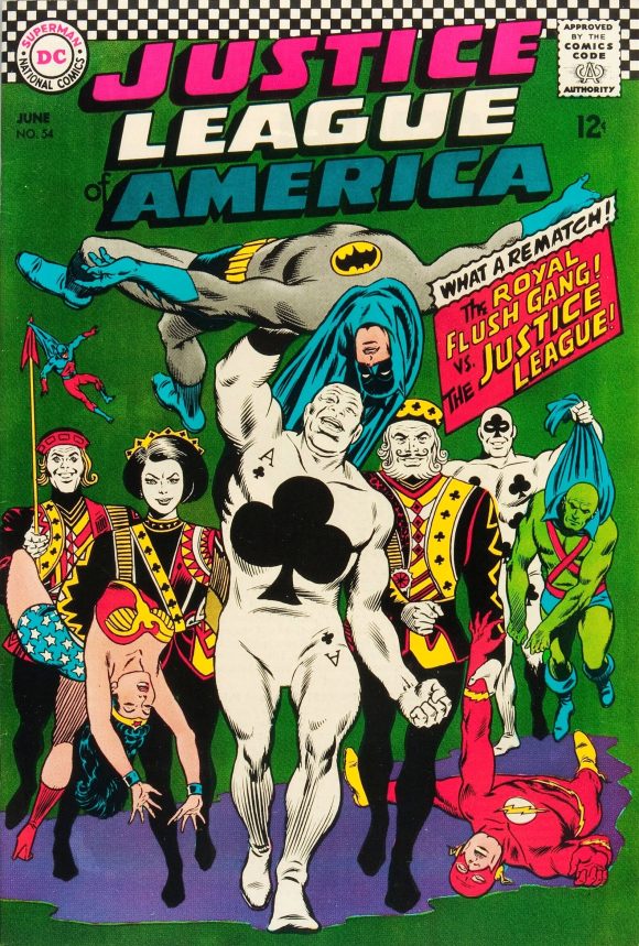 Justice League of America #54 (June 1967, DC). A royal flush is the mightiest hand in poker — but by suit. Spades is the highest, followed by hearts, then diamonds. The Royal Flush Gang are dressed as clubs, the lowest. No wonder they kept losing.
