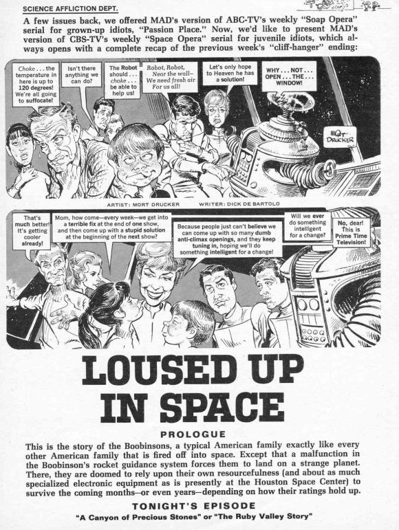 “Lost in Space” was not supposed to be an intellectual SF series. It did not offer a grand vision of the future. Nor was it using SF as political/social allegories. It was a family oriented SF adventure show. It was “Swiss Family Robinson” in outer space. In fact, the original title of the series was “Space Family Robinson”…until Irwin Allen discovered the comic book with the same title. It was aired at 7:30 pm…which in the 1960s was reserved for family oriented programs.