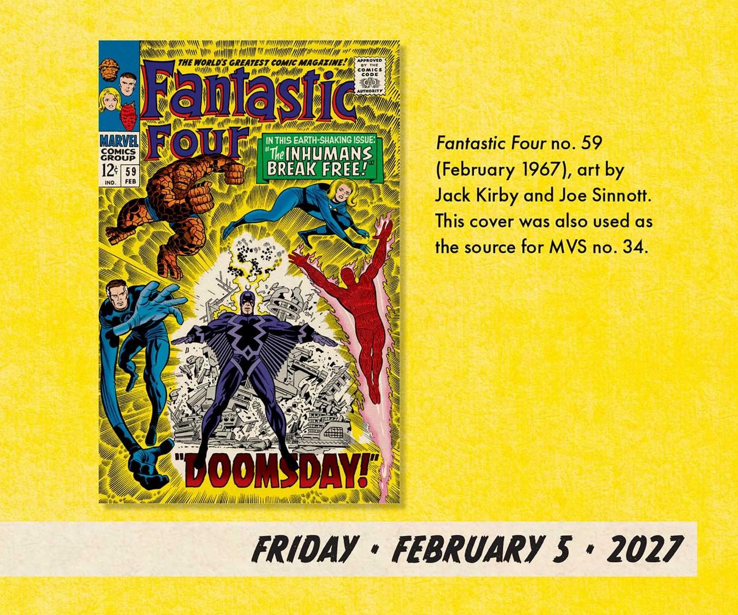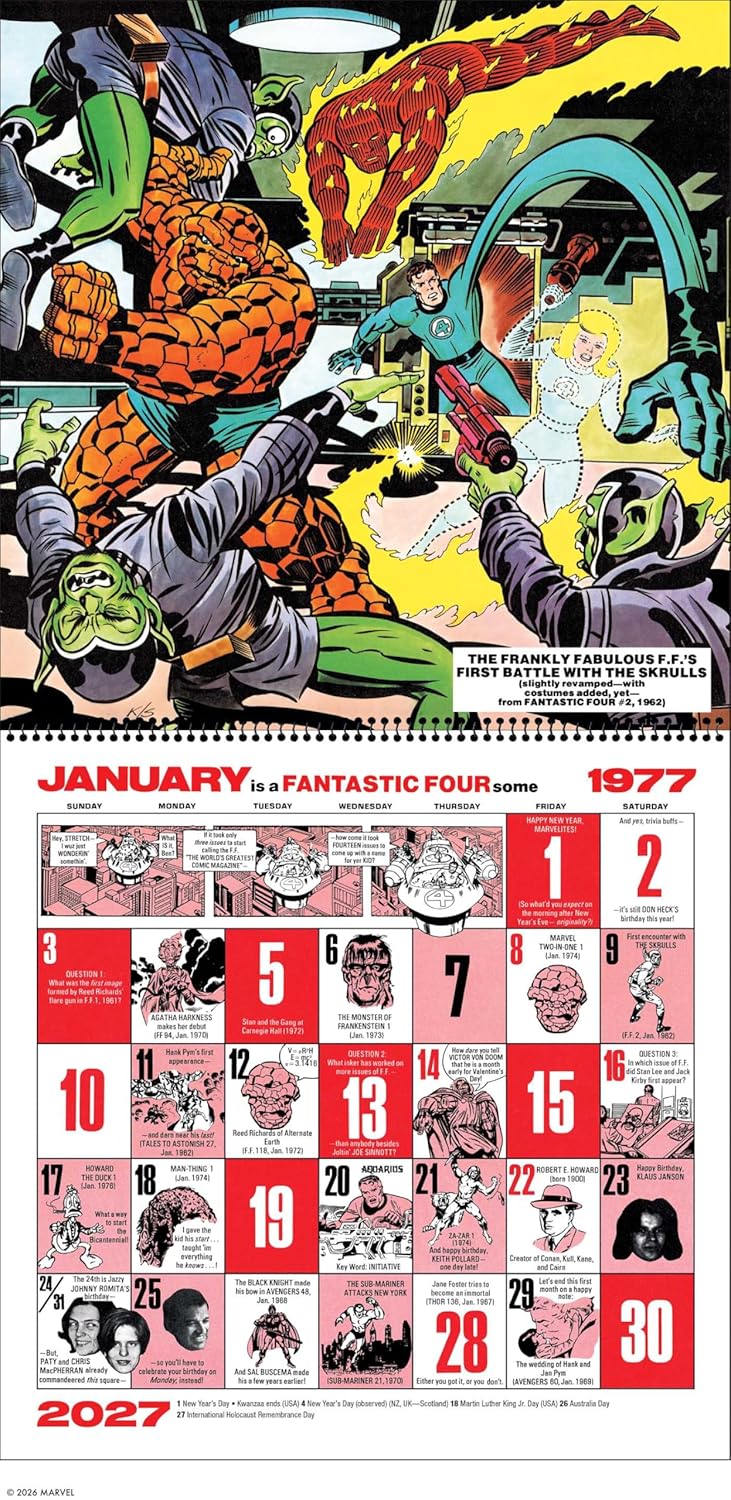 — The Memory Album Calendar has been rejiggered to follow the proper 2027 dates. For example, Jan. 1, 2027, is a Friday. Jan. 1, 1977, was a Saturday. This is the third straight year Marvel and Abrams have reprinted the calendar from 50 years prior. Marvel produced the calendars from 1975 to 1981, so it looks like more will be coming for the next several years.