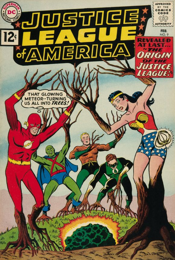 — At bottom is a take on 1961’s Justice League of America #9, which featured the first official origin of the team, by Gardner Fox, Mike Sekowsky and Bernard Sachs. (Murphy Anderson inked Sekowsky’s cover.) Wonder Woman, however, is in her later, ’80s outfit.