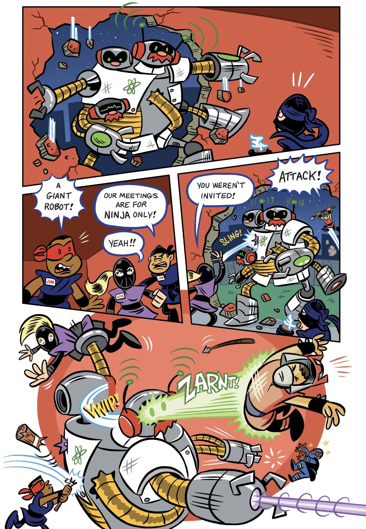 Scoot: Yeah, the villains are really fun and silly! Just fun visually to draw. Scientists, security guards. Fun to read and lots of fun visual gags in the book.