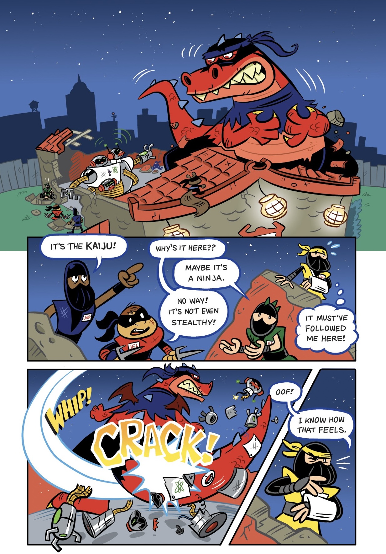 Scoot: You called and asked me about putting two things together like Ninja and Kaiju — talked about all the silly things that would happen. It was a funny idea. I did some drawings, you did too.