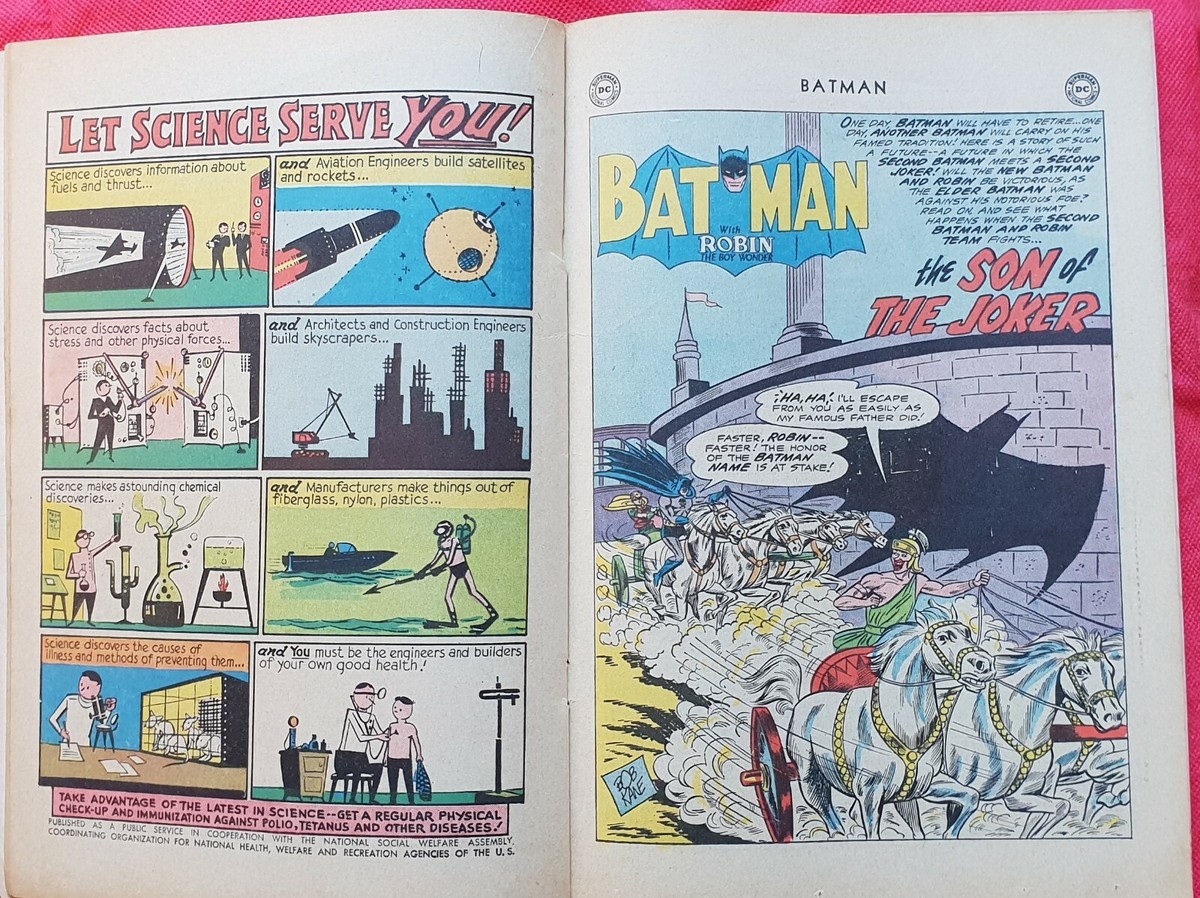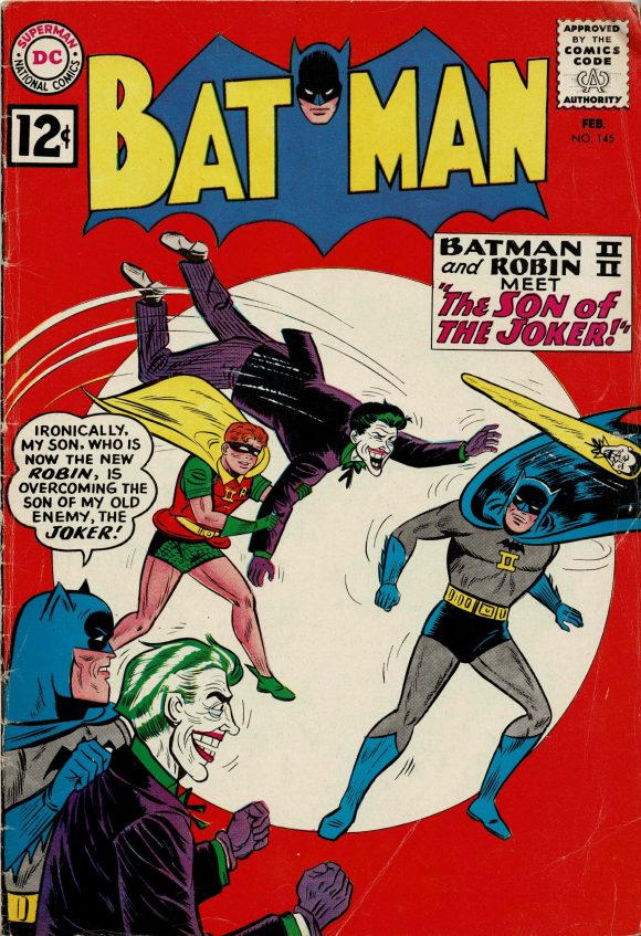 But with Batman #145 — out in late 1961 but with a February 1962 pubdate — with only 10 pages to reestablish the concept and introduce the “Son of the Joker,” this story doesn’t have much room to be memorable, satisfying or even goofy. Basically, the Joker hires a young thug to pose as his son, the original Batman figures out the ruse and rescues Batman II (Dick Grayson) and Robin II (Bruce Wayne Jr.). The end.