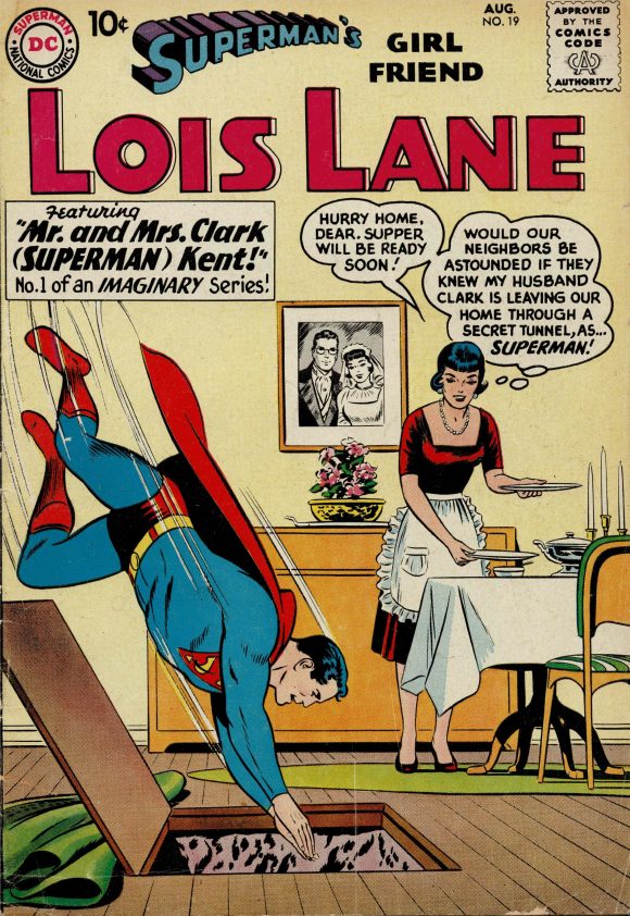 Now, comics’ first “Imaginary Story” was in Superman #19, (December 1942.) Superman, Matinee Idol! was written by Jerry Siegel, laid out by Joe Shuster, penciled by Ed Dobrotka, and inked by John Sikela. Stories like this (as well as a few morbid ones) would occasionally pop up in Superman’s comics during WWII, but weren’t used during the 50s. However, in 1960, Mort Weisinger revived the concept. The first Silver Age “Imaginary Story” is Mr. and Mrs. Clark (Superman) Kent! from Lois Lane #19 (August 1960).
