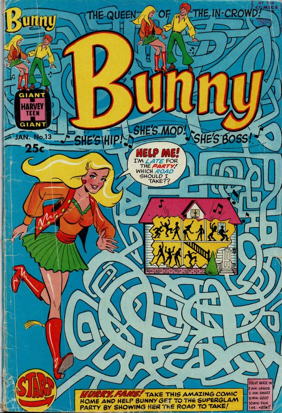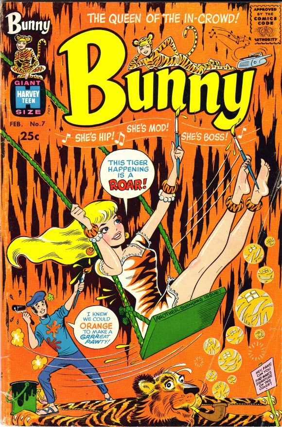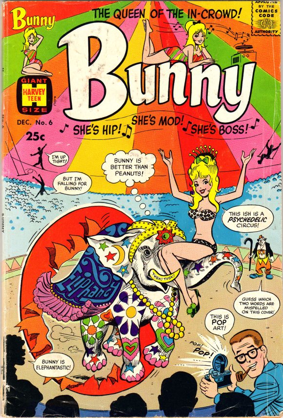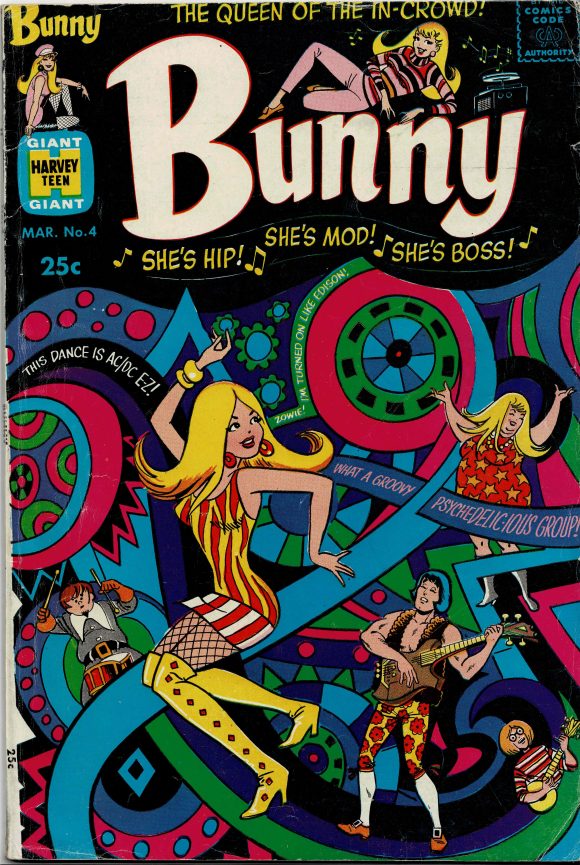 Harvey and Eisman created every issue of Bunny, which were 68 pages long for a quarter, and with a second character, the Oddball superhero Fruitman, who eventually got a one-shot special. Toward the end of the run, Bunny went down to 52 pages and there were reprints of earlier stories. Sol Brodsky did some inking over Hy’s pencils, while Howard Post occasionally drew “Sooper Hippie,” and Henry Scarpelli drew an episode of Fruitman. Bunny also appeared in Harvey Pop Comics #2, which spotlighted the bands from her comics.