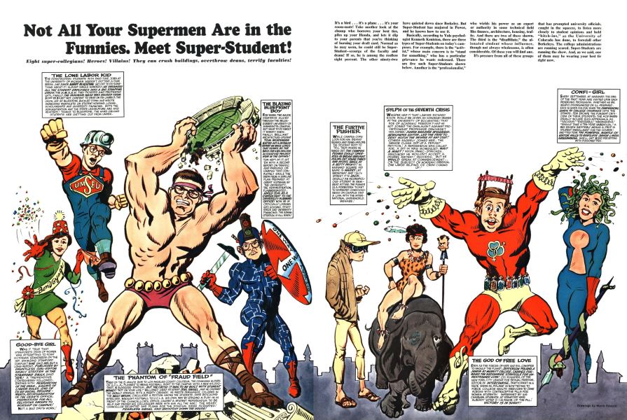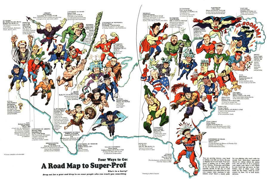 The first time I ever saw Marie’s cartooning was in the September 1966 issue of Esquire. It had an article about Marvel Comics illustrated by Jack Kirby, and the magazine hired Marie to create humorous illustrations for a piece about faux college-age superheroes. They were so outstanding that I wondered, “Why hasn’t Marvel hired her to draw actual superhero stories, and not merely coloring?”