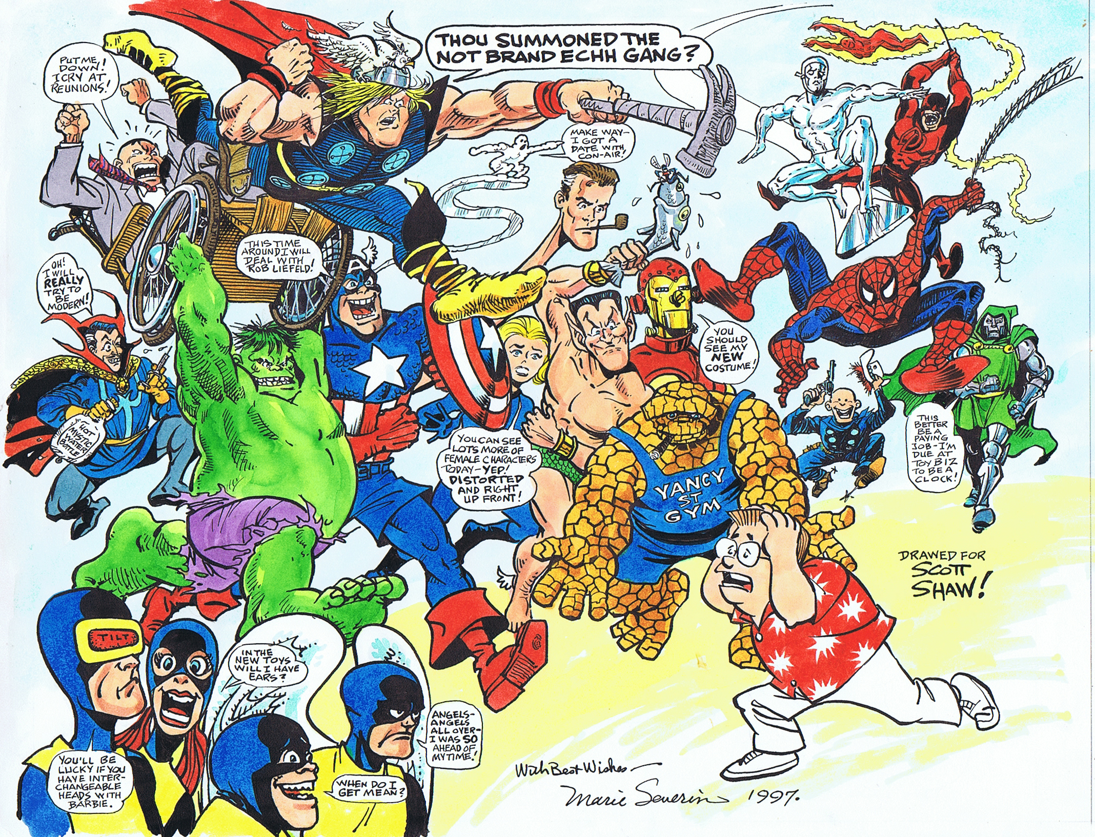 I always enjoyed conversing with Marie and her good friend Ramona Fradon, two of my favorite cartoonists. In 1997, I asked Marie if she’d accept a commission I hoped she would draw. Marie agreed, with a wide grin on her face. When I received it, I was the one with the bigger smile. I’m very lucky to have known the sweet, salty, and super-funny Marie Severin and here’s the proof: