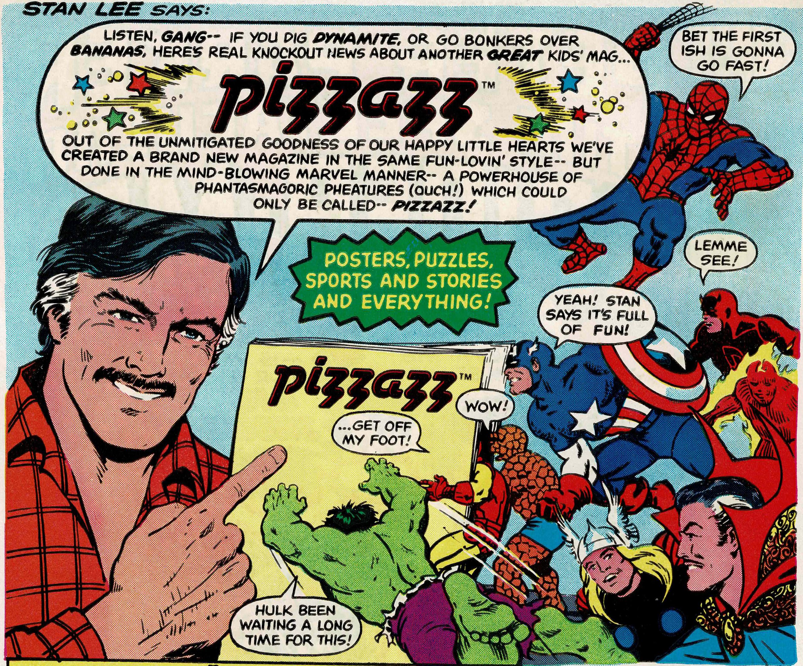By this time, Marie was primarily doing promotional stuff for Marvel, including this ad for Pizzazz, a slick magazine for kids. It makes Smilin’ Stan look like the guy who sells paper towels, with a subtle joke about Daredevil’s lack of sight.