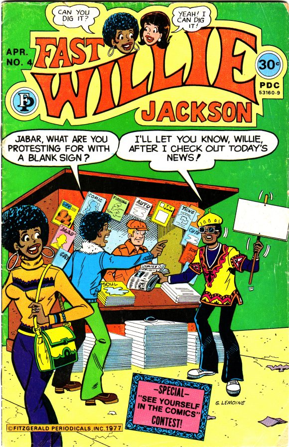 Following Golden Legacy, Bertram introduced a second comic book series that was full of Black characters, but with a strong vibe of Archie Comics: Fast Willie Jackson (October 1976 to September 1977) was created to fill a perceived need, serving a demographic that had been under-represented in American comic books. (At that time, Archie’s comics featured very few characters that were not Caucasian.) Fast Willie Jackson followed Archie’s path of short strips focused on friends and hi-jinx, but with a deeper political lean.