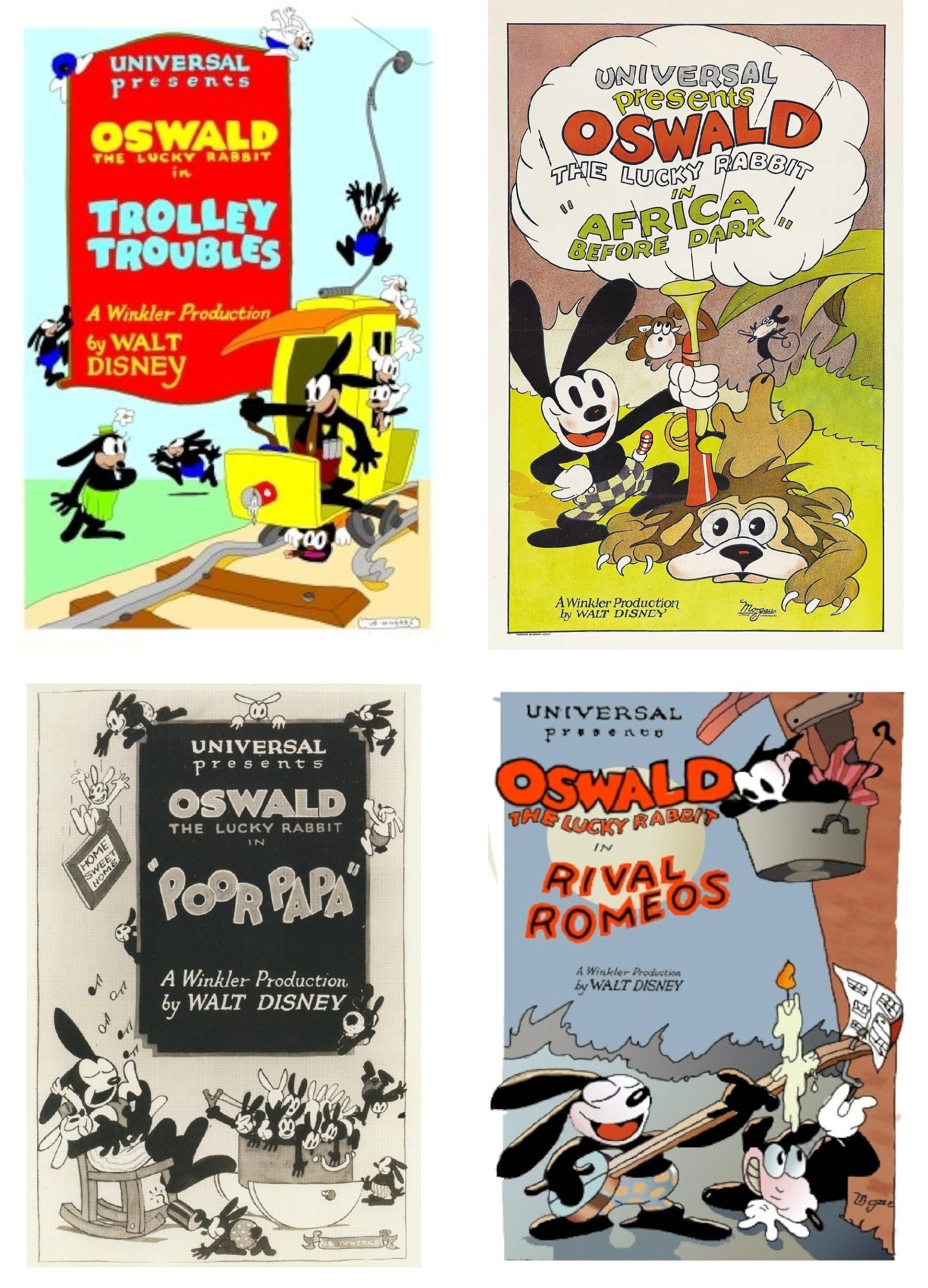Clockwise from top left, Trolley Troubles (1927), Africa Before Dark (1928), Rival Romeos (1928), and Poor Papa (1928).