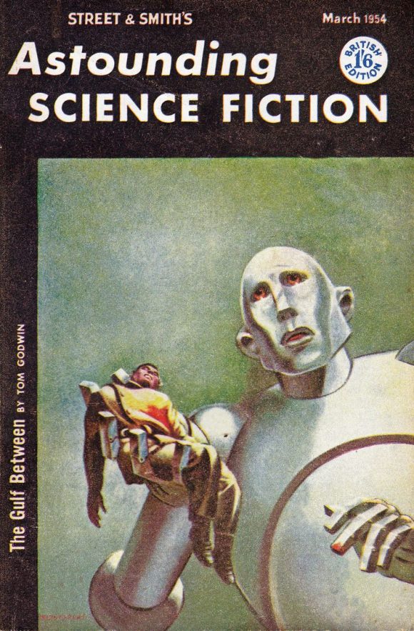 Astounding Science Fiction (March 1954). One of the most famous images from the Freas oeuvre, the cover for “The Gulf Between” by Tom Godwin, later revised and repurposed by the artist as the album cover for Queen’s 1977 album, News of the World.