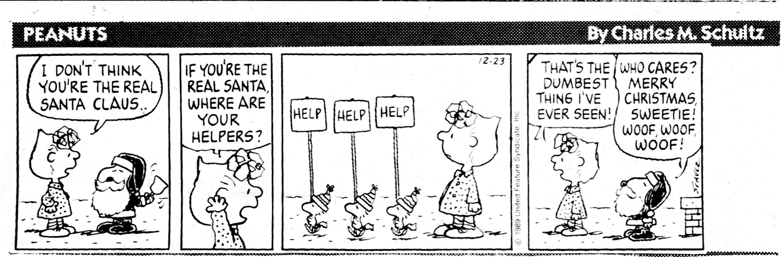 1. 12/23/99: Did anyone else notice that’s a speech, not thought, balloon emanating from Snoopy? A Christmas miracle?!?