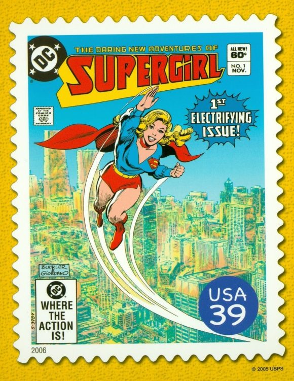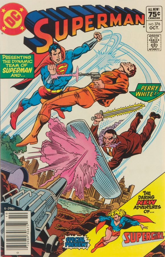 Superman #376 (October 1982). Yes, that is the preview of my Daring New Adventures of Supergirl title blurbed in the lower right, but I swear I picked this one because of the flying, cigar-smoking Perry White on it! Inked by Giacoia. (By the way, Rich’s cover of Daring New Adventures of Supergirl #1 was selected to represent the modern version of the character in the 2006 DC Comics Super Heroes commemorative stamp set from the US Postal Service — certainly the closest I’ll ever come to being on a postage stamp!)