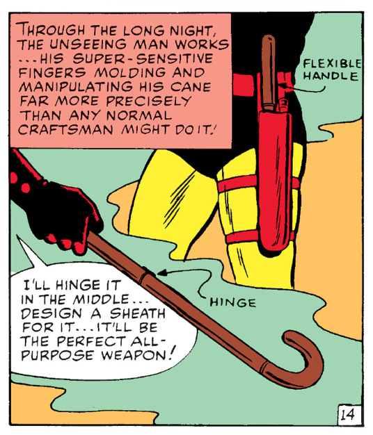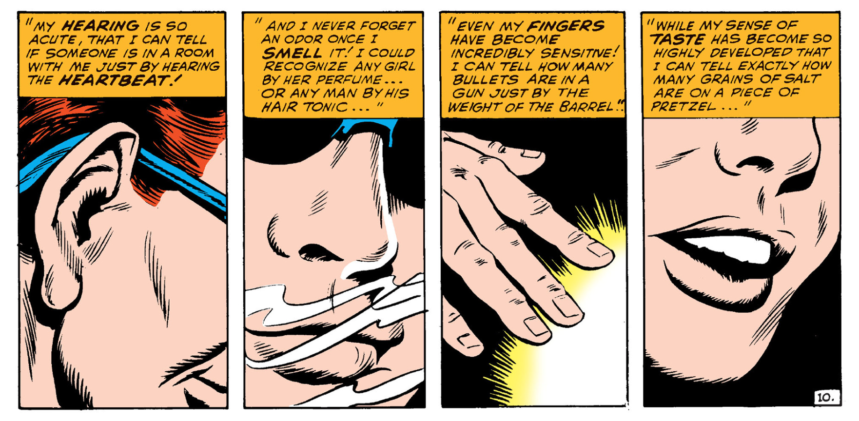 2. The gimmick. The hero is blind… but his other senses have become so acute he can create a picture of what he can’t see through hearing, smell, taste, and echolocation. Thank you, improperly handled radioactive waste!