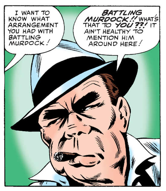 11. The Fixer. The gloriously pig-faced wretch of a human being who ordered Battling Murdoch’s murder, the “beefy, overweight, fear-filled figure” you can’t help cheer when he’s felled by a heart attack in the subway while being chased by Daredevil.