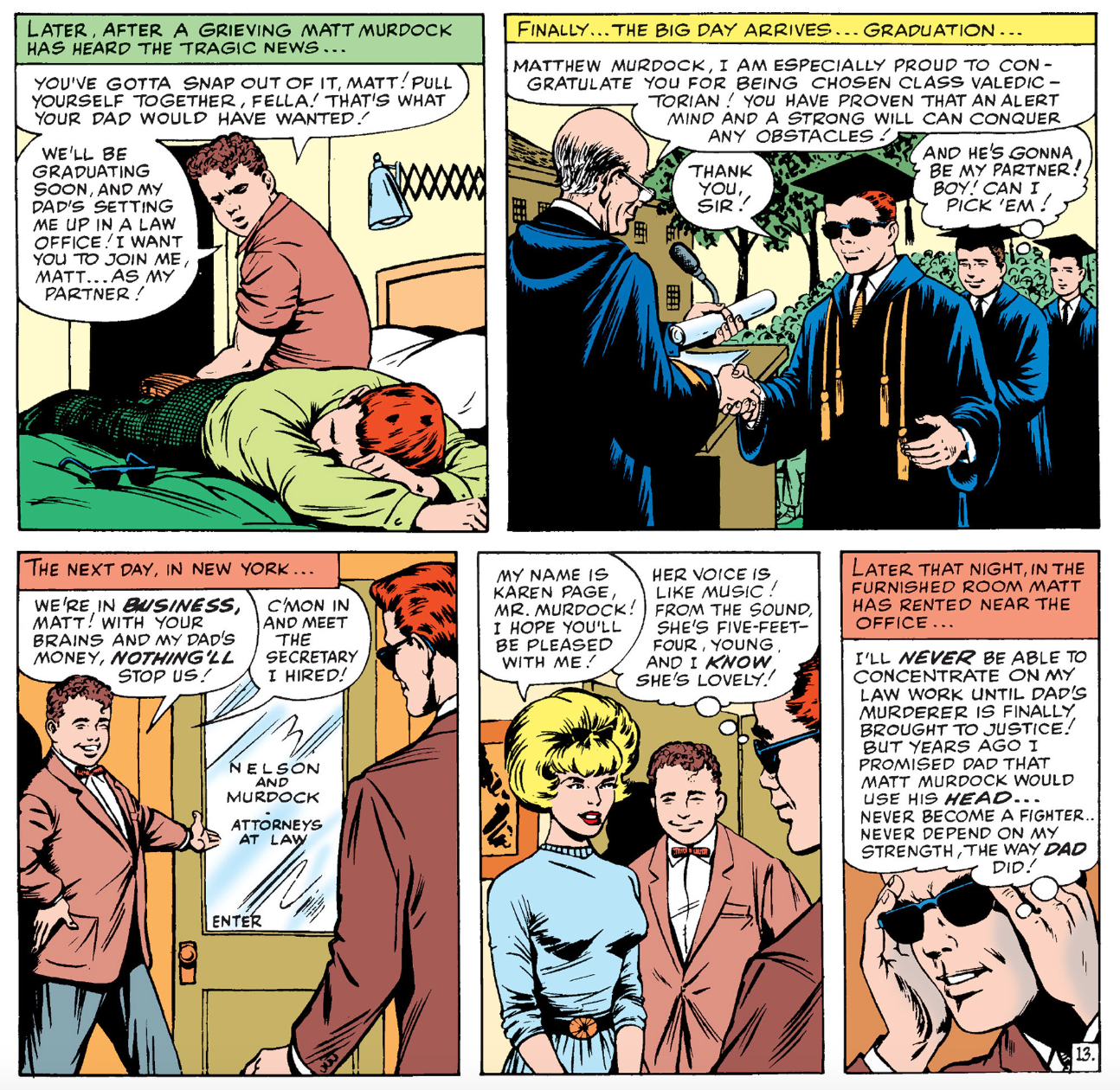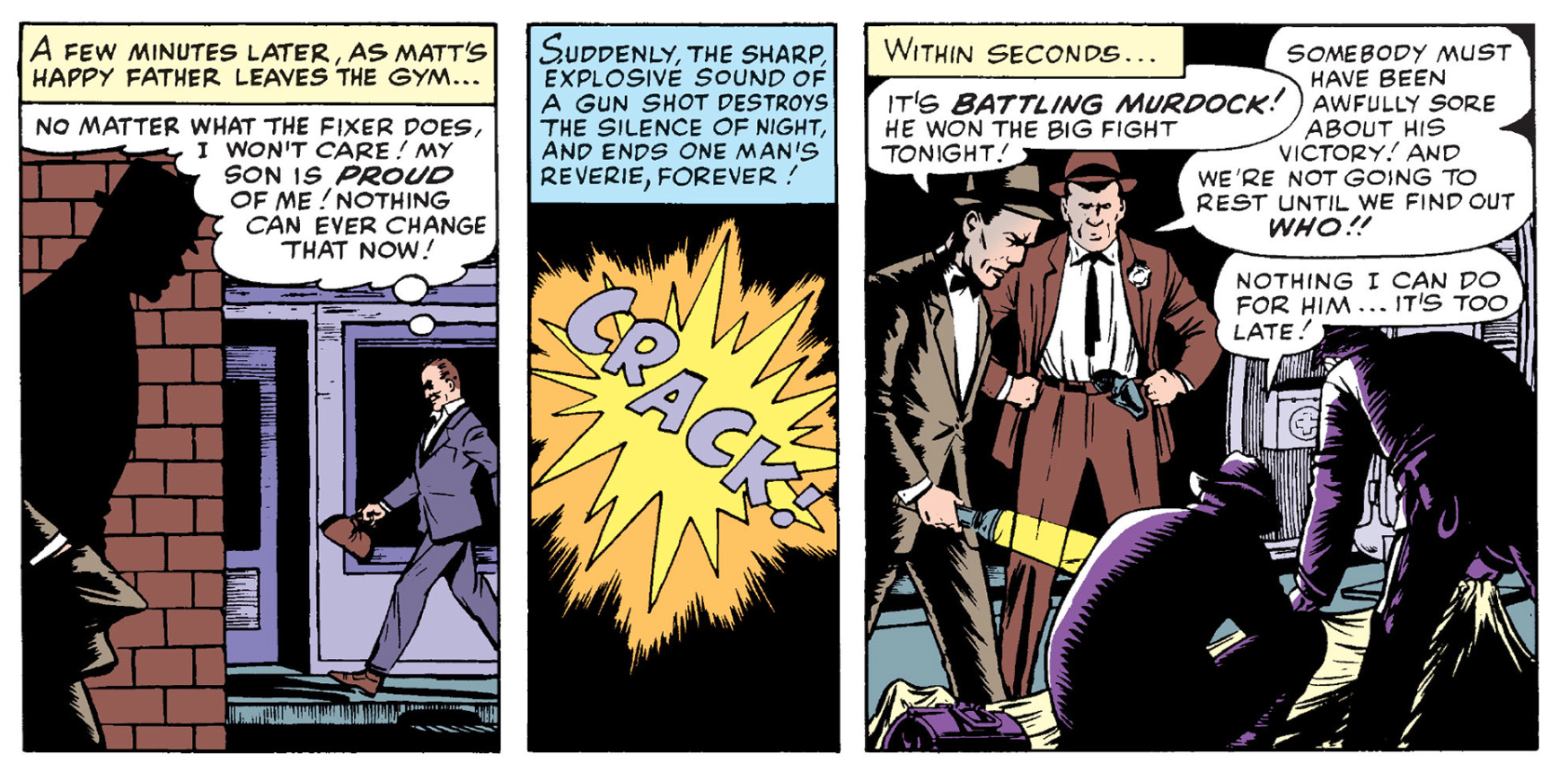 7. “Battling” Murdoch is a good dad. Everybody in Daredevil #1 gets a chance to tell their stories, and unlike Peter Parker’s Uncle Ben, who was sacrificed after appearing in only five panels of the Spider-Man origin, speaking in only two, Matt’s dad had an actual arc in the issue. Readers felt his death not based just on a kindly face and some avuncular kidding around but because we saw what Murdoch sacrificed for his son.