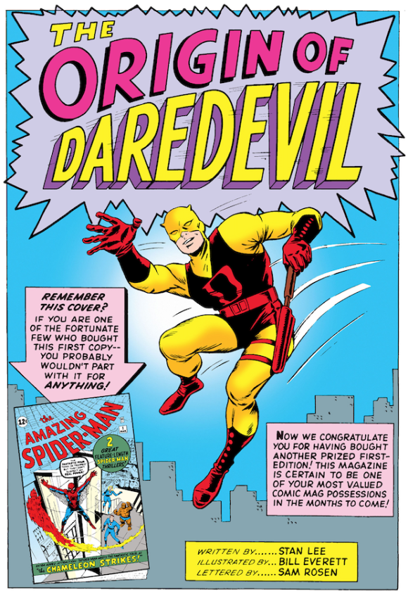 That’s not to say the origins of his predecessor heroes — Spider-Man and the Fantastic Four, both of which get callouts on the cover of Daredevil #1 — aren’t classics, Spidey’s in particular; his realization that “with great power comes great responsibility” has entered the vernacular. And even if the FF’s back story is an echo of Jack Kirby’s earlier origin of the Challengers of the Unknown for DC Comics, it still stands.