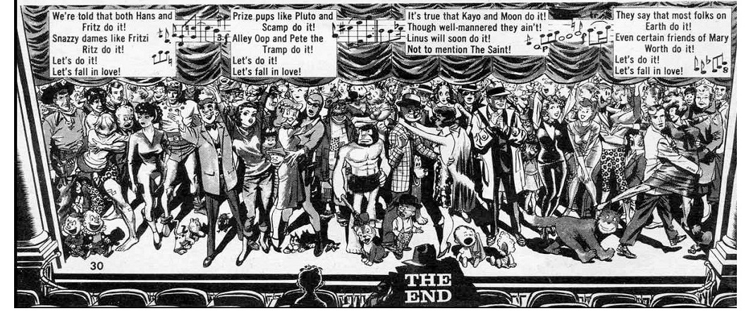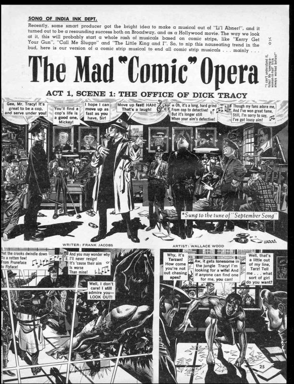 I think it’s the best single story Wally Wood (June 17, 1927 – November 2, 1981) ever drew. The draftsmanship is breathtaking, his storytelling and panel construction dead on, and, as written by MADman Frank Jacobs, “The Mad Comic Opera” features more than 50 newspaper comic-strip characters, all drawn in Wood’s realistic style but recognizable as the work of their original creators, all caught up in the kidnapping of Little Orphan Annie by Rex Morgan, M.D. and told in the style of a Broadway musical, including: