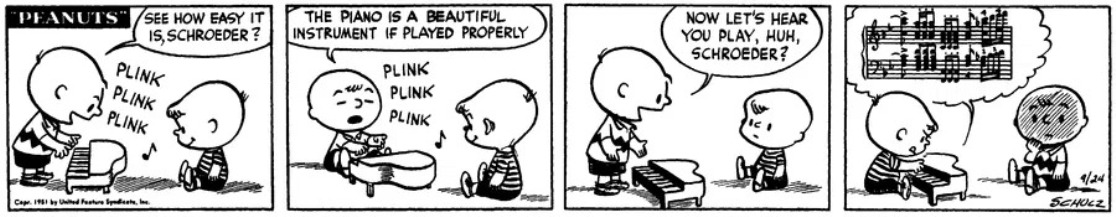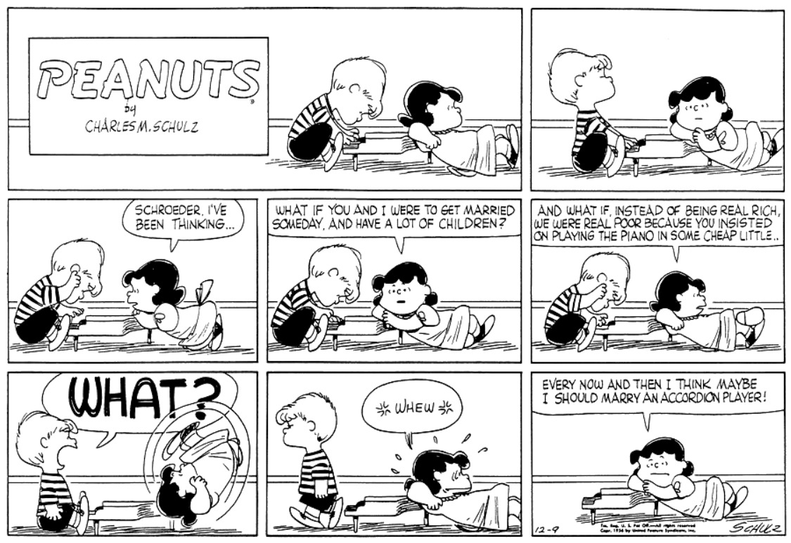 September 14, 1951. (Schroeder’s toy piano was a duplicate of one that Schulz gave to Meredith when she was two years old.)