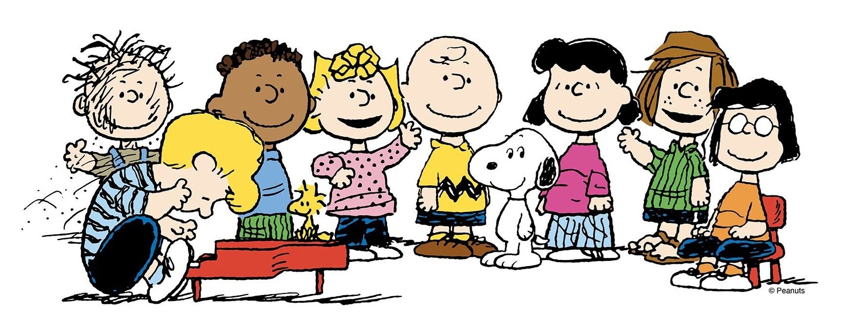 “Pig-Pen,” Schroeder, Franklin, Woodstock, Sally, Charlie Brown. Snoopy, Lucy, Peppermint Patty, and Marcie.
