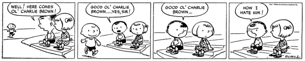 The first Peanuts strip debuted October 2, 1950 and in its first panel introduced good ol’ Charlie Brown. (A bit of trivia: Schulz borrowed the name of Charlie Brown from a former co-worker.) Right from the start, Charlie Brown was maligned by other kids in the neighborhood.