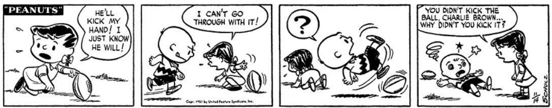 Nevertheless, Charlie Brown never did get to kick the football in all the years of the strip when Lucy was holding it in place. (NOTE From Dan: I still believe that should have been the last strip…)