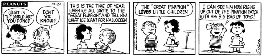 October 26, 1959. First mention of the “Great Pumpkin.”