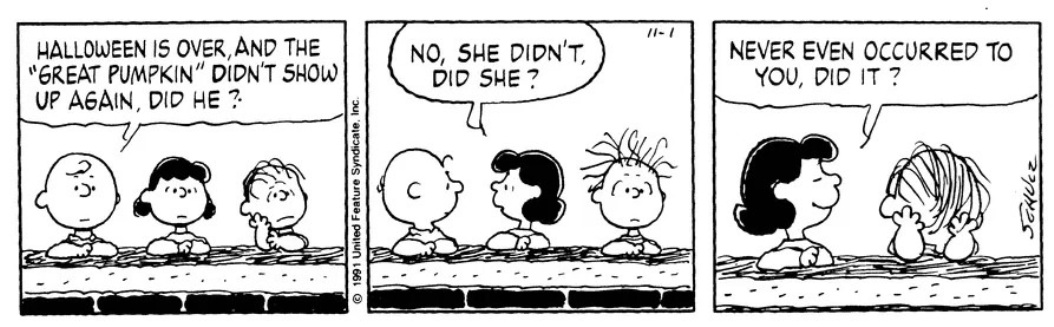 However, Lucy, ever the feminist, eventually brought up something about the “Great Pumpkin” that shook Linus right to his core:
